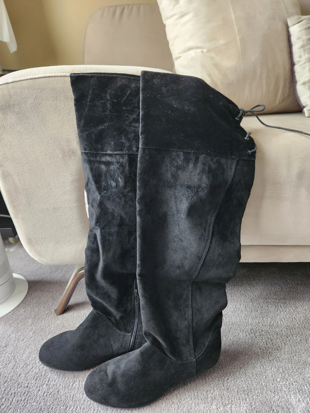 Over-the-knee boots, black in colour. The boots are made of suede-like material, with a zipper on the inside and drawstrings at the top.