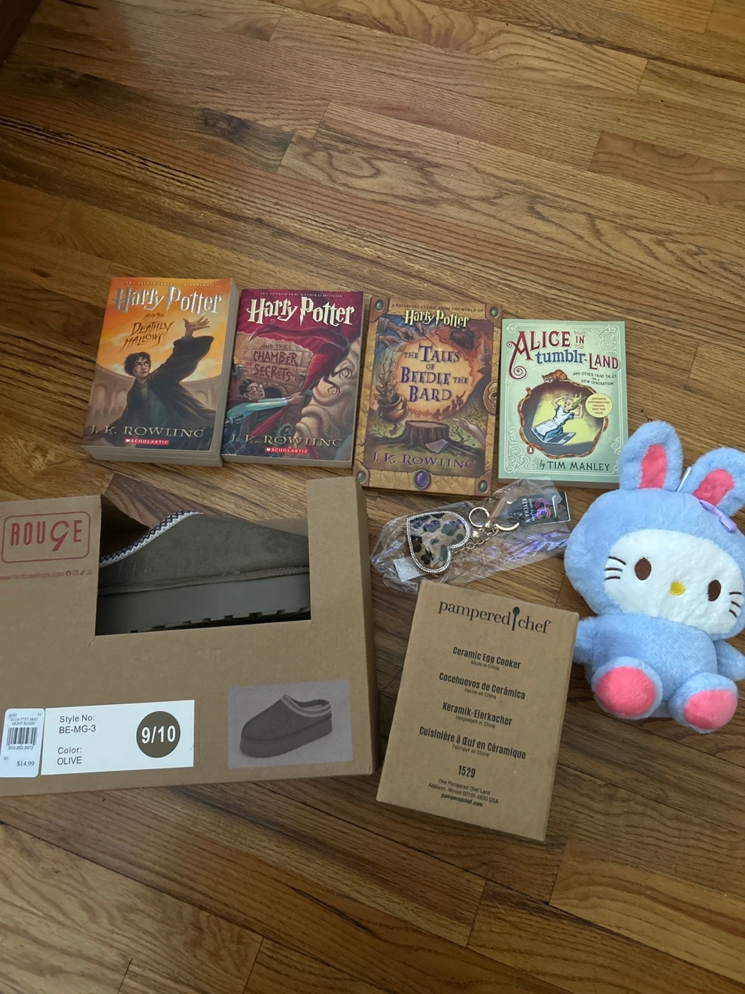 647Bundle of various items. Includes multiple books, slippers, a keychain, plush toy and a ceramic egg cooker. Must atleast take 2 items.