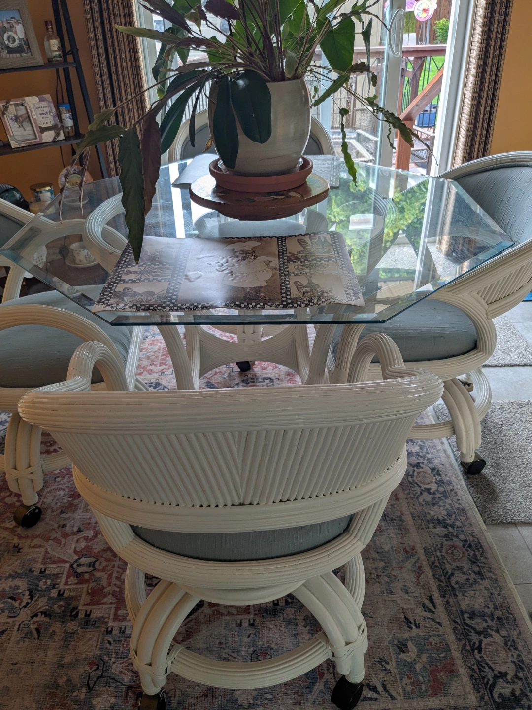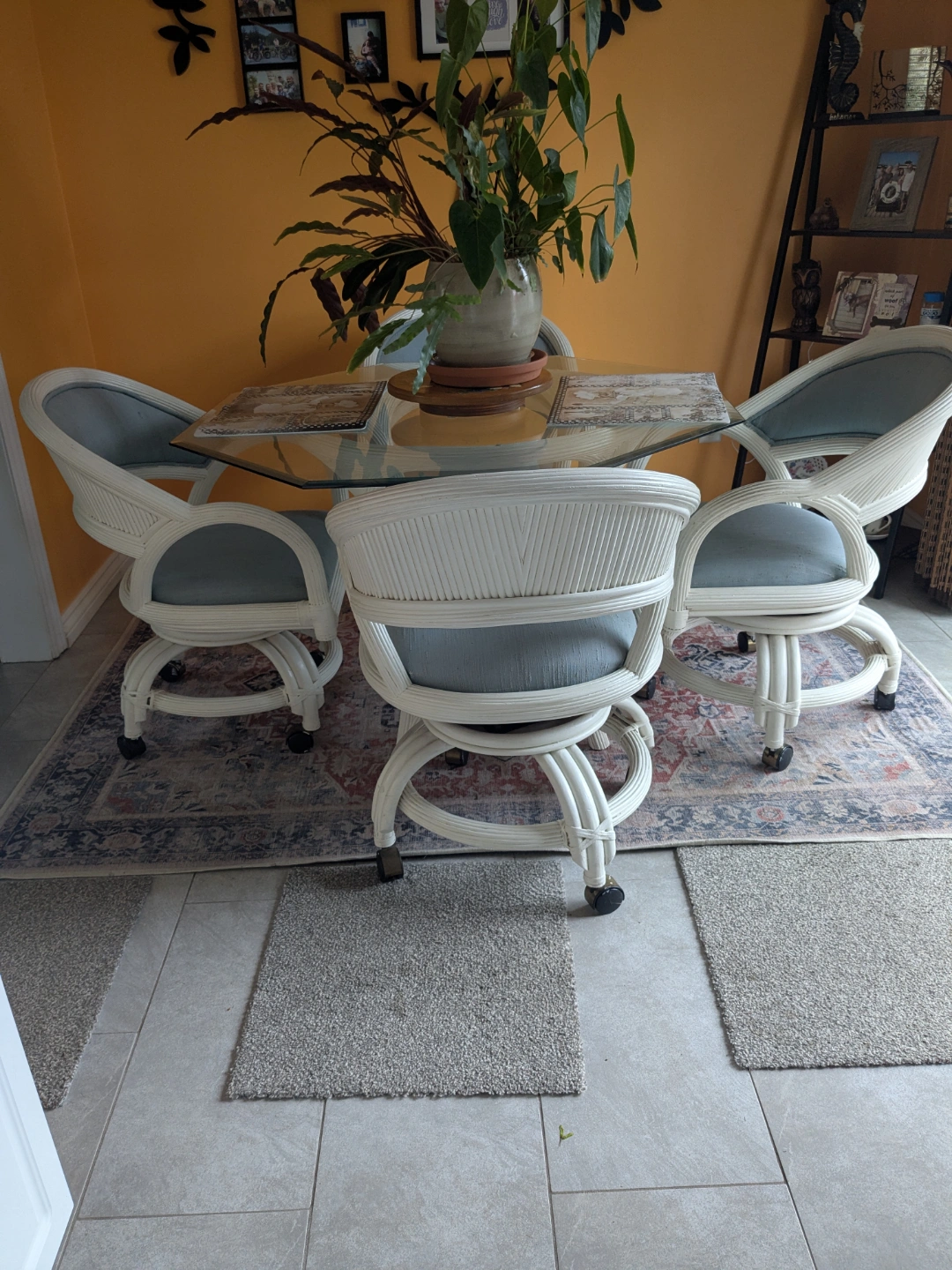 hexagon glass top table. White rattan chairs with blue cushions. Chairs swivel. A great spot to enjoy a nice meal with family and friends.