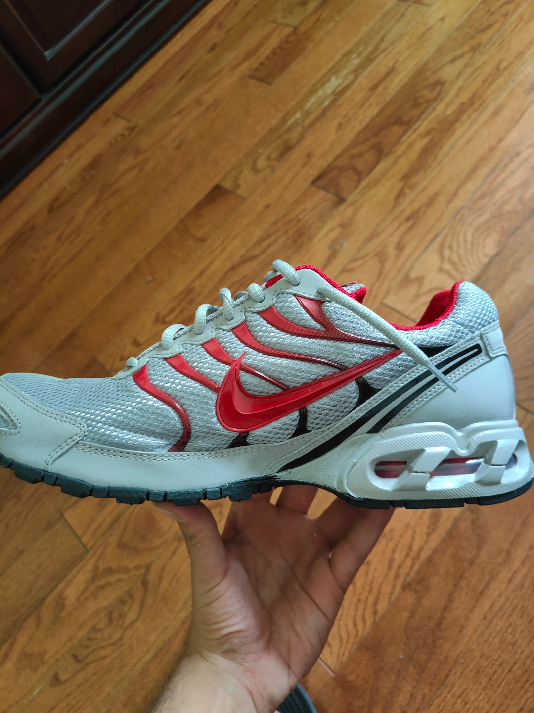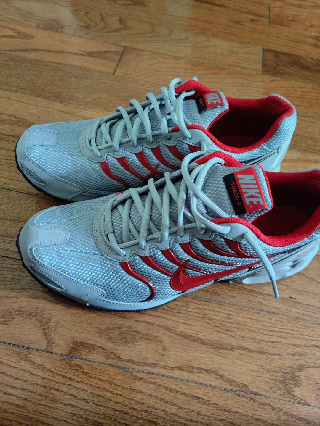 Grey running shoes. Red accents. Lace-up closure. The perfect shoes for your daily walk or run. Willing to negotiate the price. Selling asap. Size 12.5 Mens. Will need to pick up.