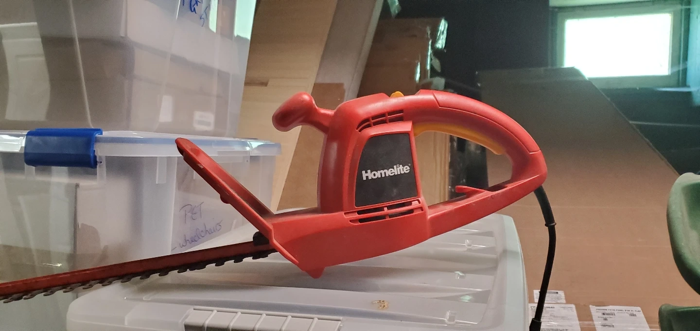 444Red electric hedge trimmer. Features a handle, and a blade. Great for shaping bushes and other shrubbery.