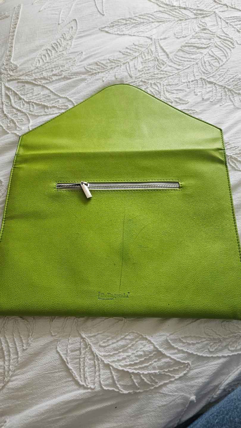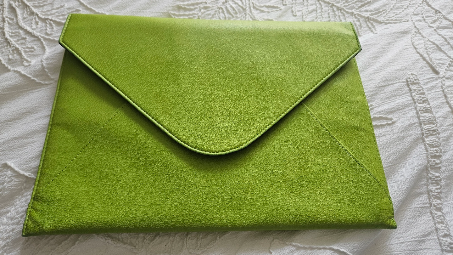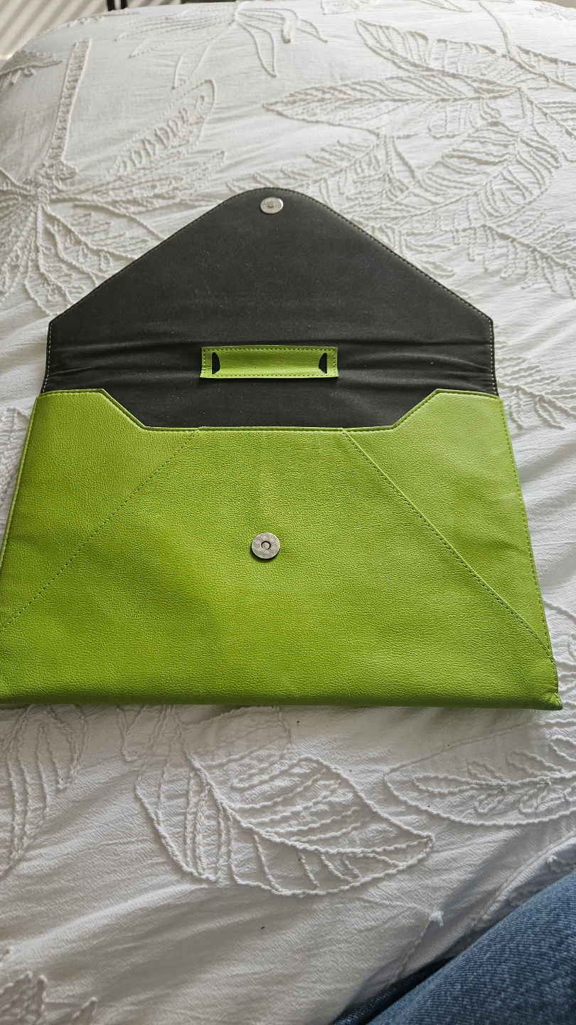 I originally purchased this really cool laptop sleeve from an awesome Canadian creator "BellagendaGifts" on Etsy. Beautiful faux leather lime green colour (easy to find in your bag!!), envelope style, magnetic closure, with a little zipper section on the back for pens etc. Definitely keeps your laptop and charger safe and secure. There is a scuff line which I tried to capture in pics 3 and 4.