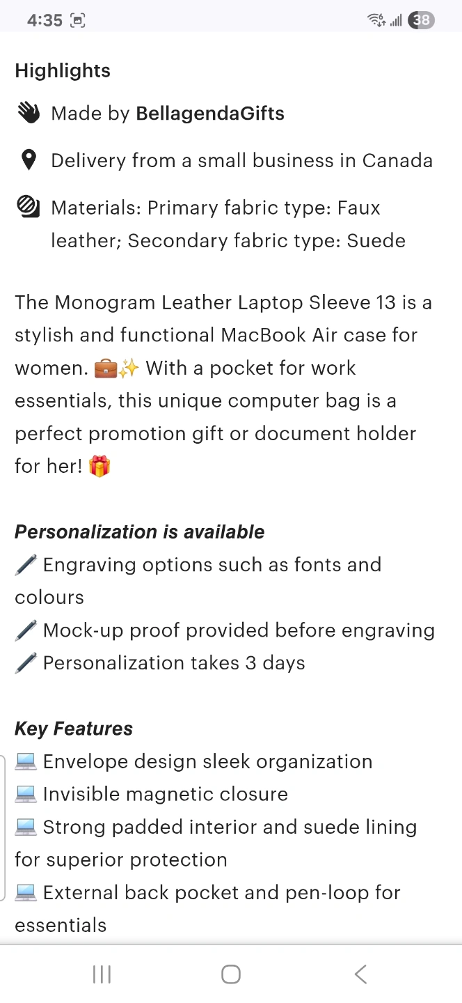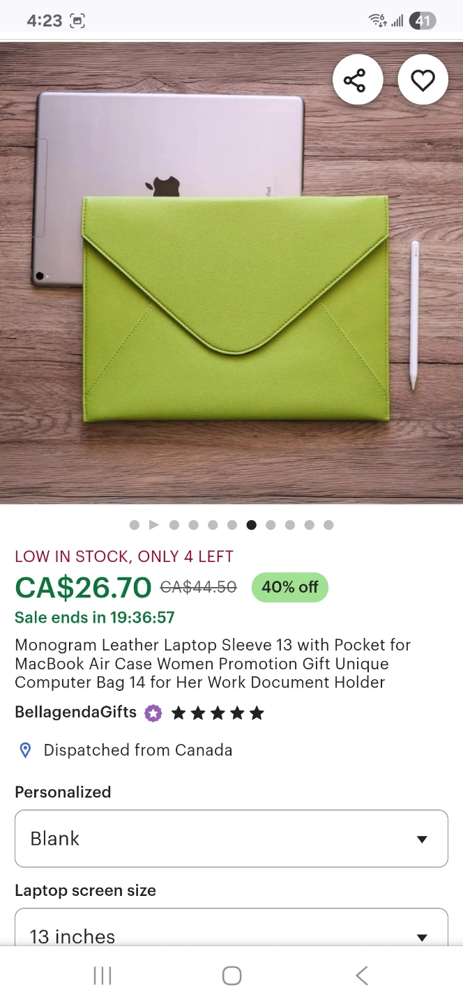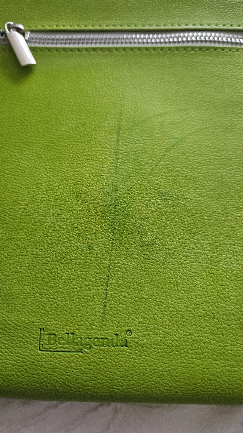 I originally purchased this really cool laptop sleeve from an awesome Canadian creator "BellagendaGifts" on Etsy. Beautiful faux leather lime green colour (easy to find in your bag!!), envelope style, magnetic closure, with a little zipper section on the back for pens etc. Definitely keeps your laptop and charger safe and secure. There is a scuff line which I tried to capture in pics 3 and 4.