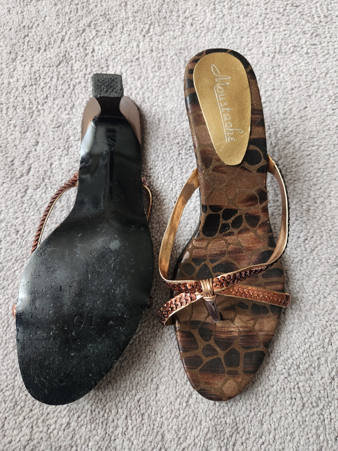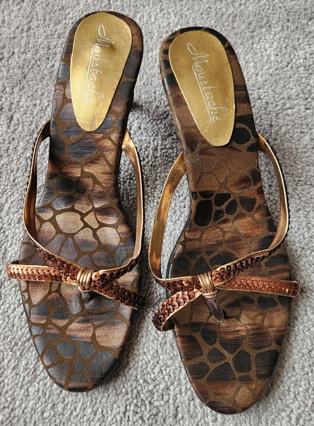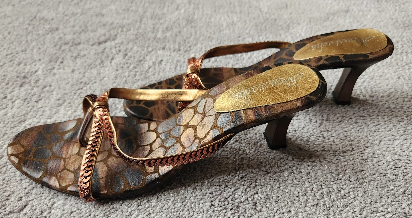 Sandals with a heel. Feature an animal print design. Sequin detailing. Wear them for an evening out.