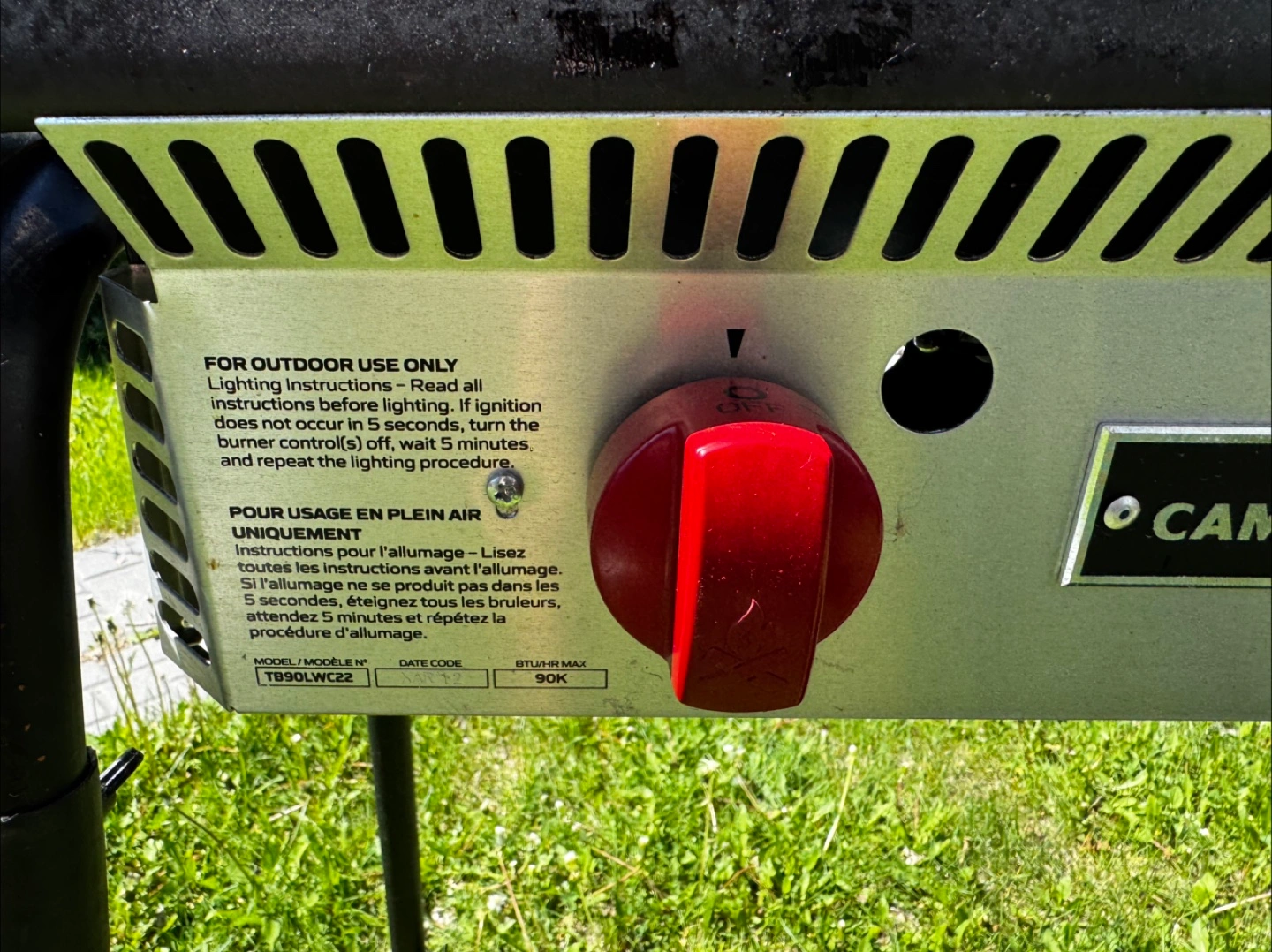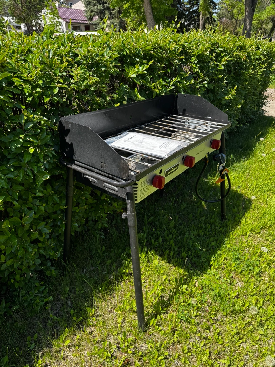 Features three burners with red knobs. A silver cooking surface with a black grill top. Also, included is a grill top and instruction booklet.