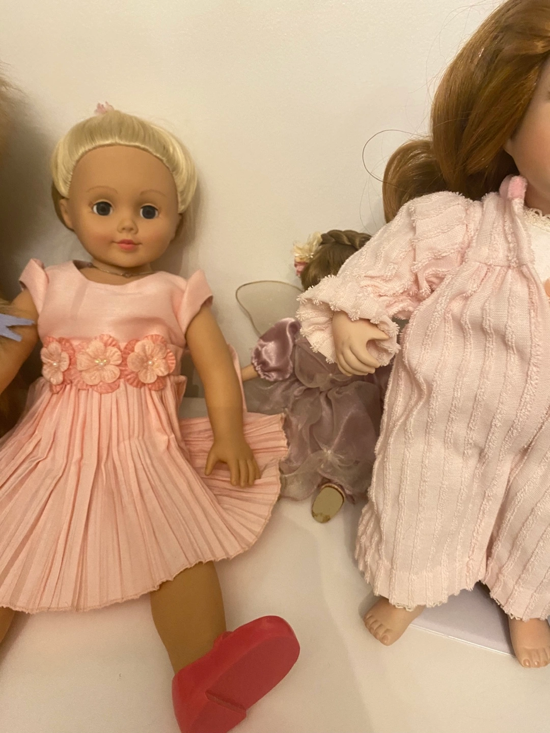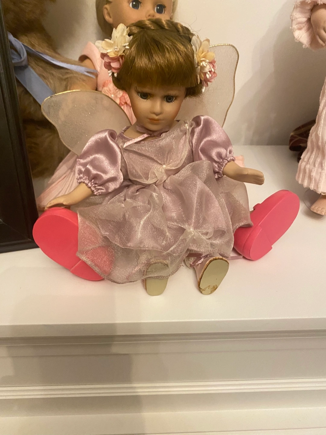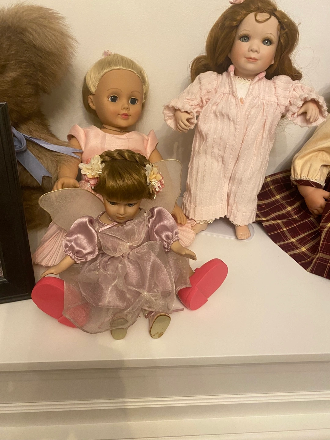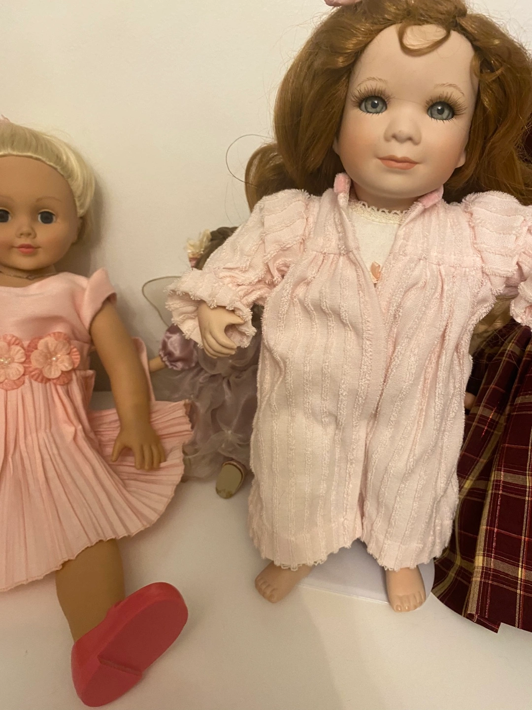 Porcelain angel doll. Porcelain doll on stand wearing pink house coat. Madame Alexander doll in peach dress. All are in excellent condition. All 3 for $20