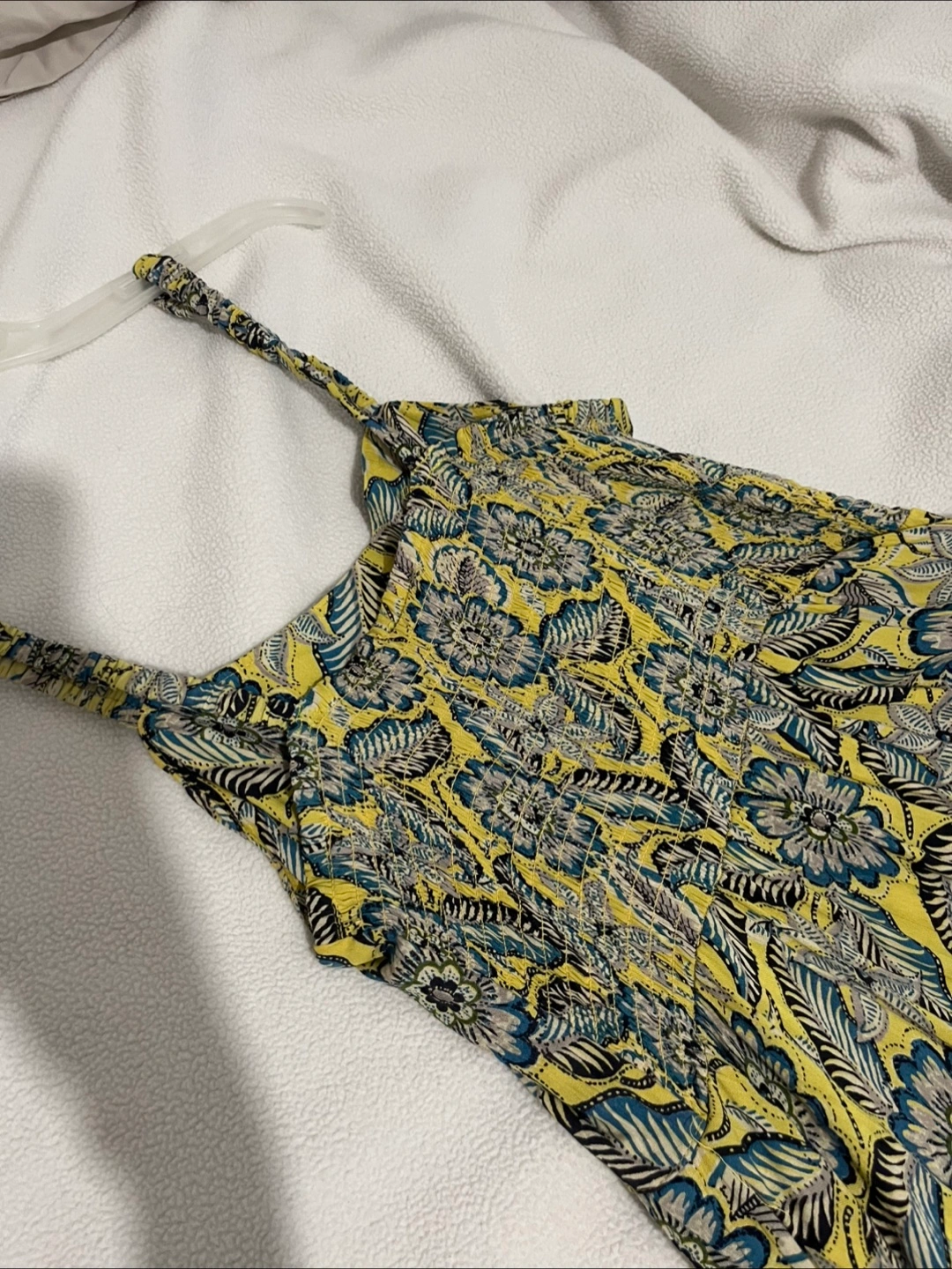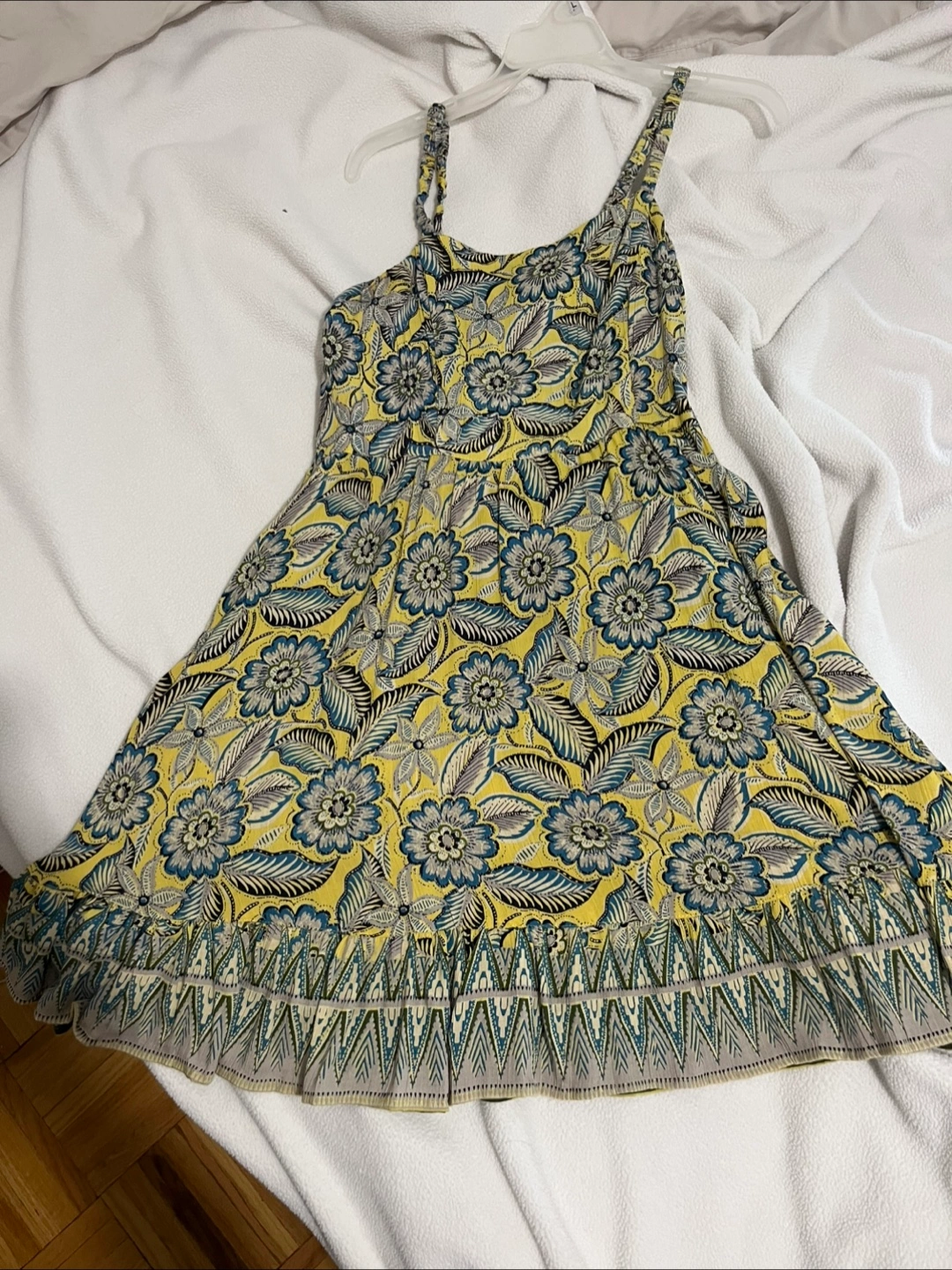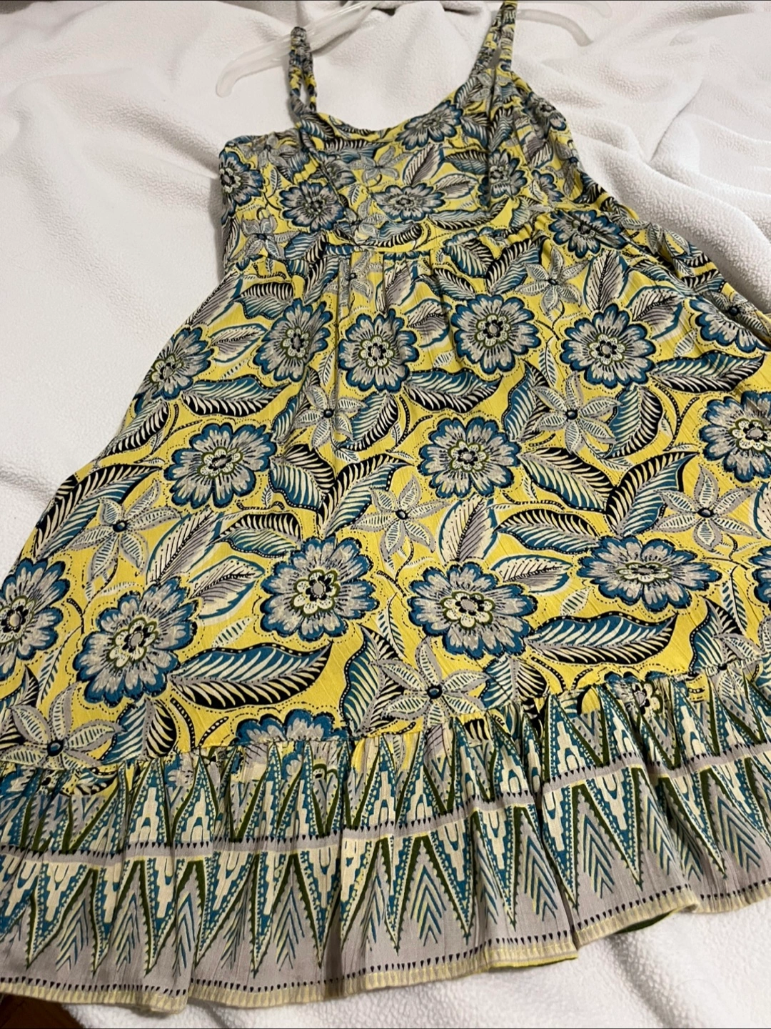 Dress with a yellow floral print. Ruffled hem. Adjustable straps. A perfect dress for a summer day.