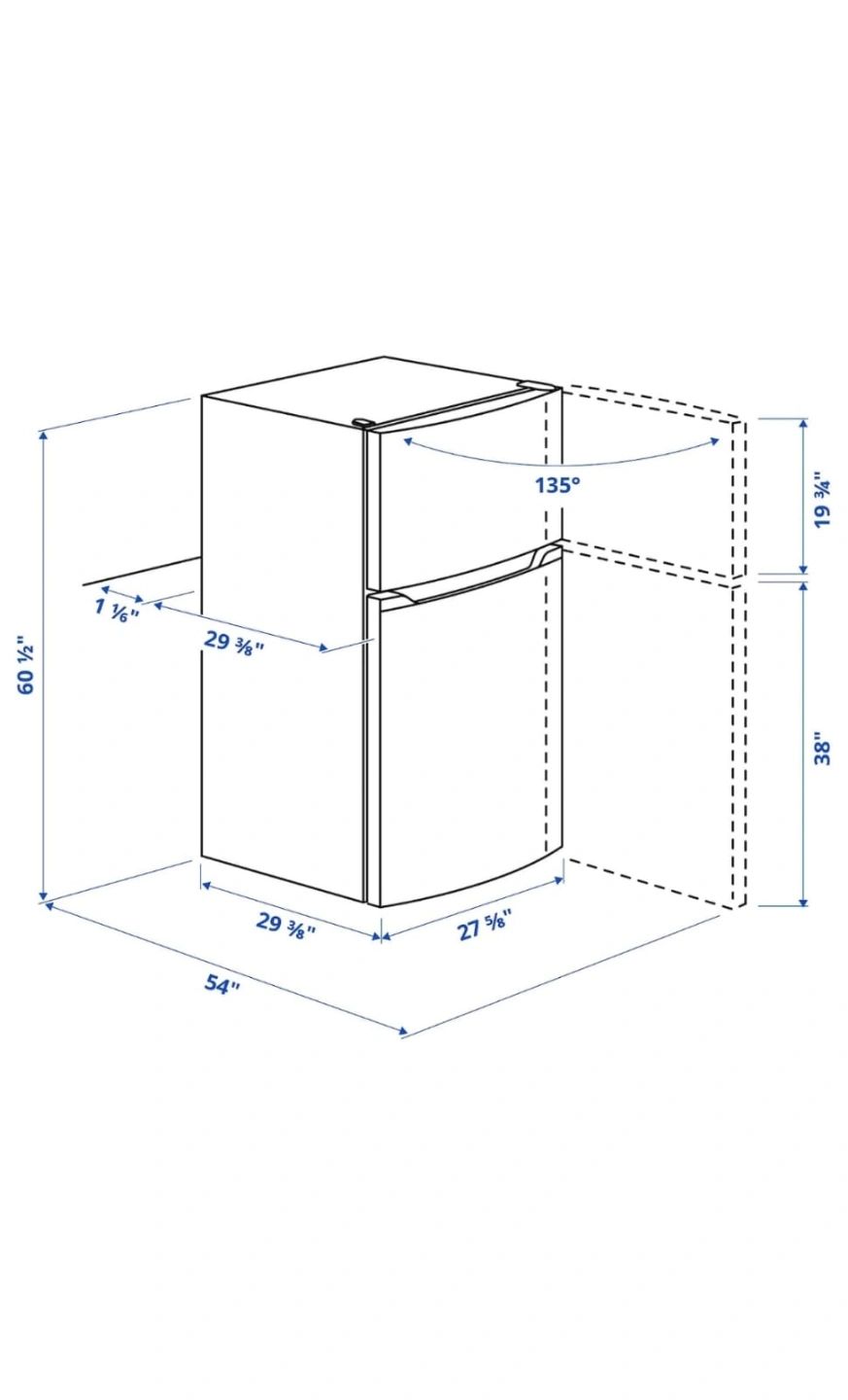 Fridge with a top freezer. Dimensions are provided in the second image. Refrigerators make excellent additions to homes, especially to help with food storage.