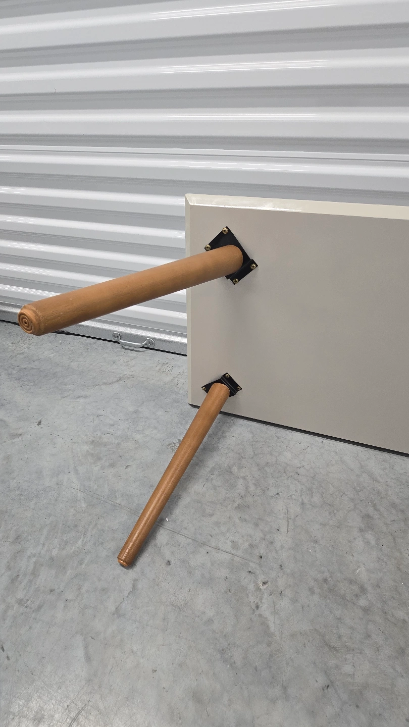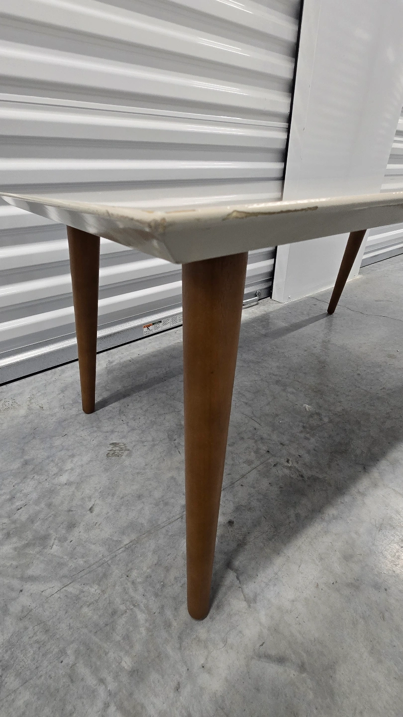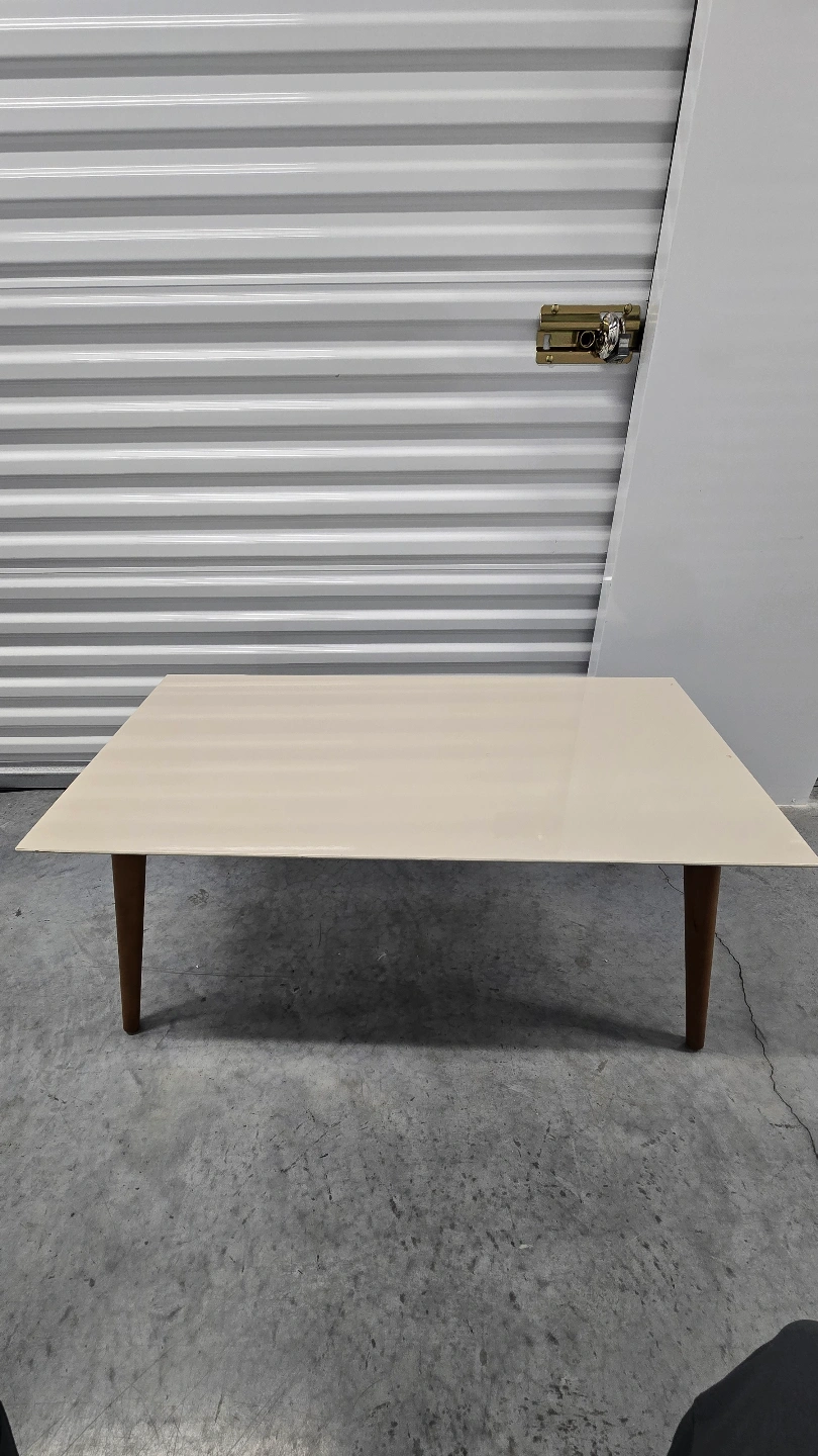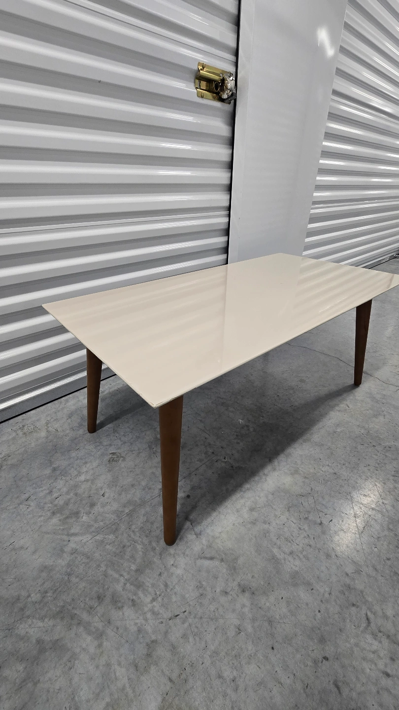 Rectangular coffee table. Features a light-colored glossy top. Supported by four wooden legs. A perfect place to put your feet up after a long day.