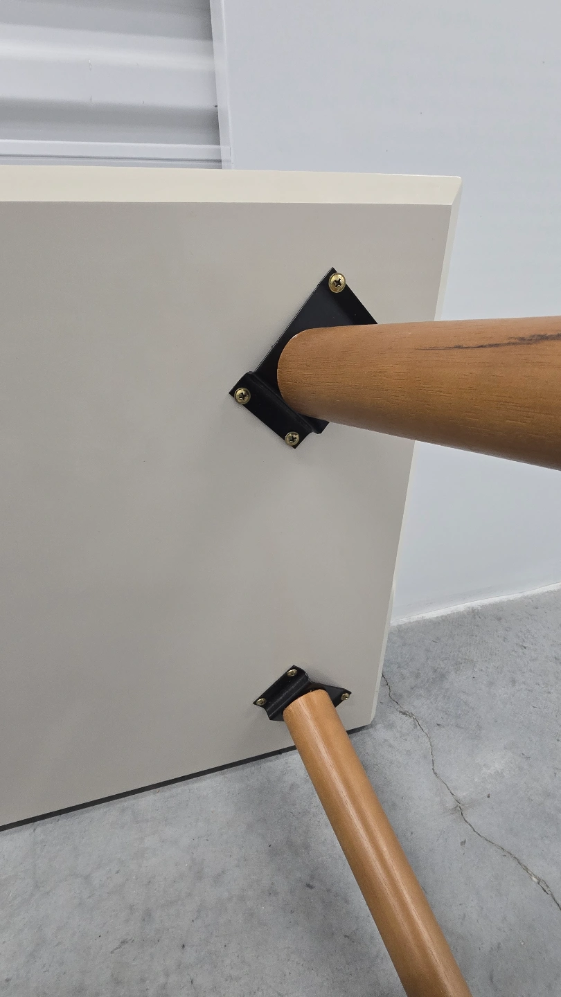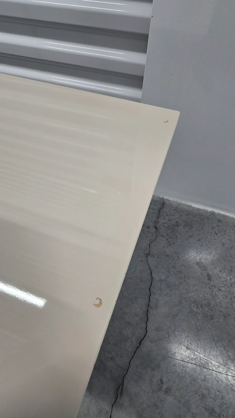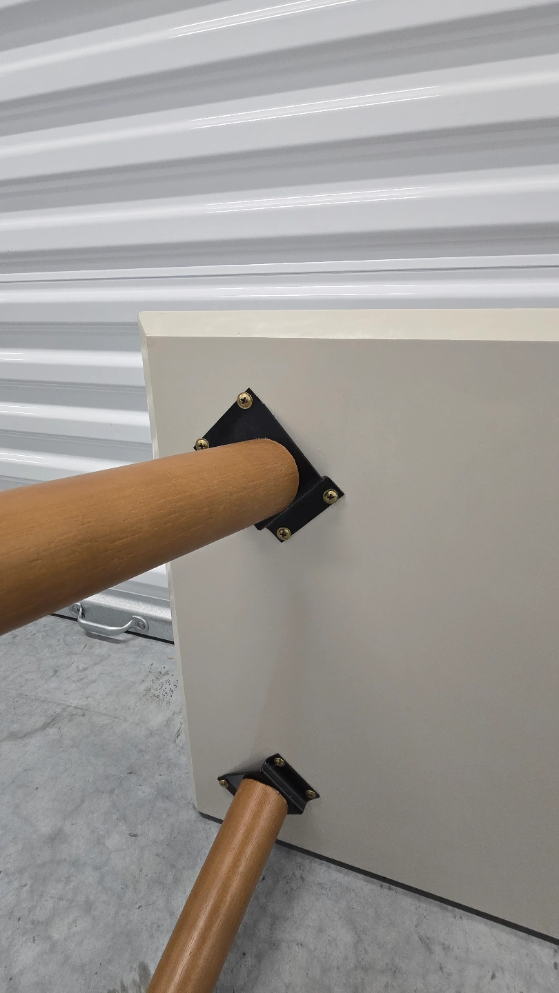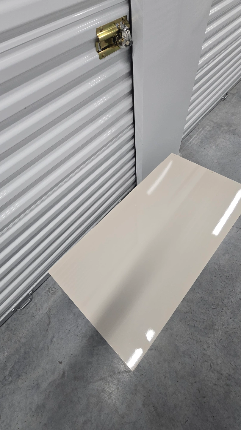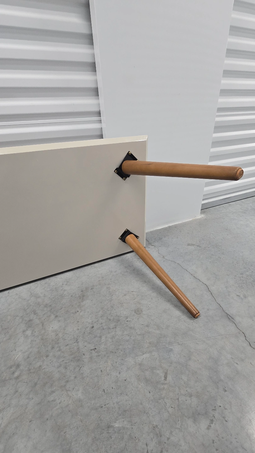 Rectangular coffee table. Features a light-colored glossy top. Supported by four wooden legs. A perfect place to put your feet up after a long day.
