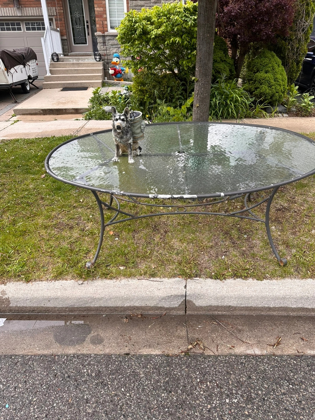 40Free Patio table, round shape. Metal frame. Glass top. Perfect for a peaceful outdoor gathering. Dog statue free Donhaven rd Markham