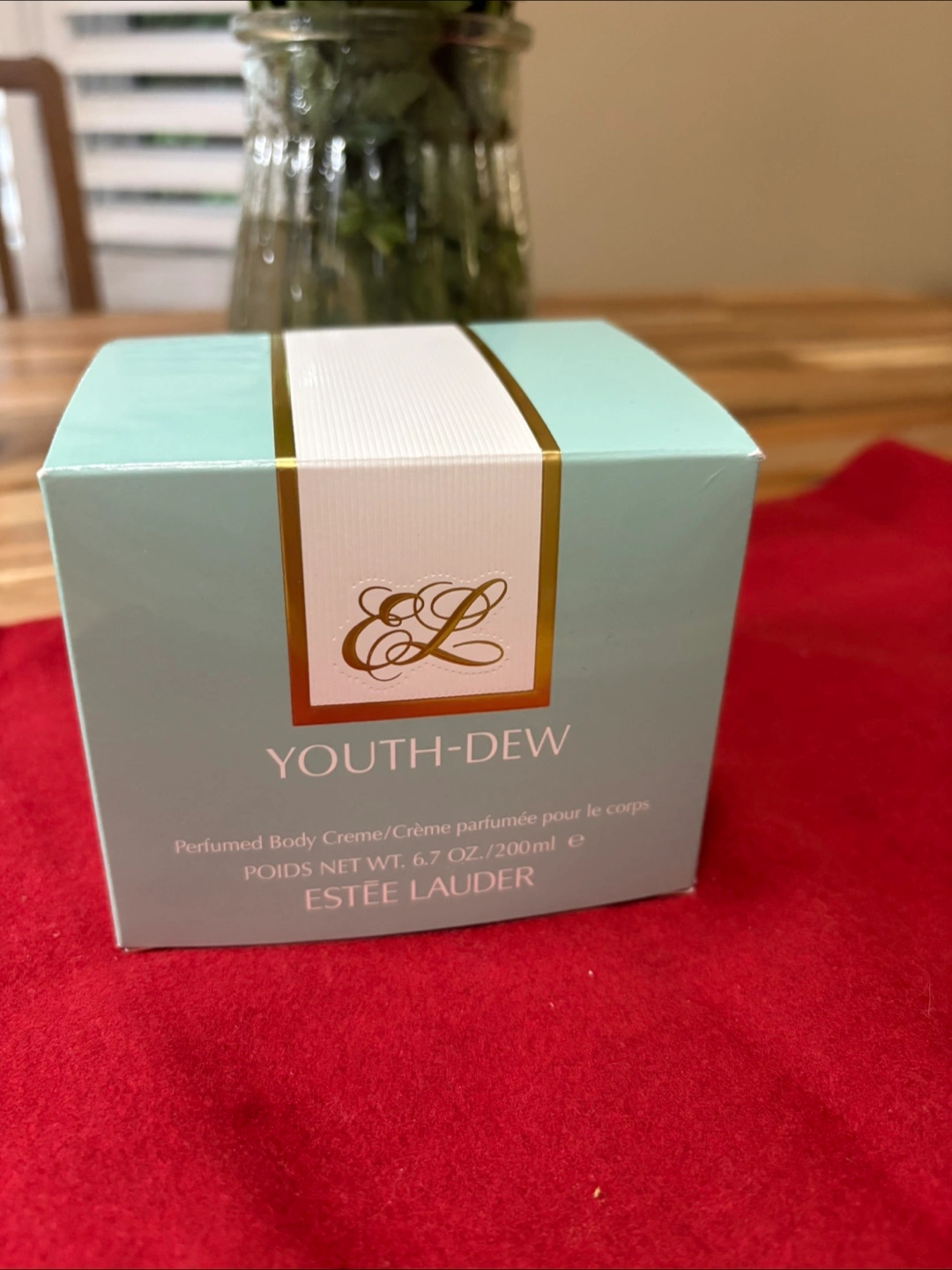 A lovely body crème. It is perfect for those moments of self-care and relaxation. The box is mint green with a gold and white accent stripe. The product name is Youth-Dew, with a description of perfumed body crème. Retail price 61