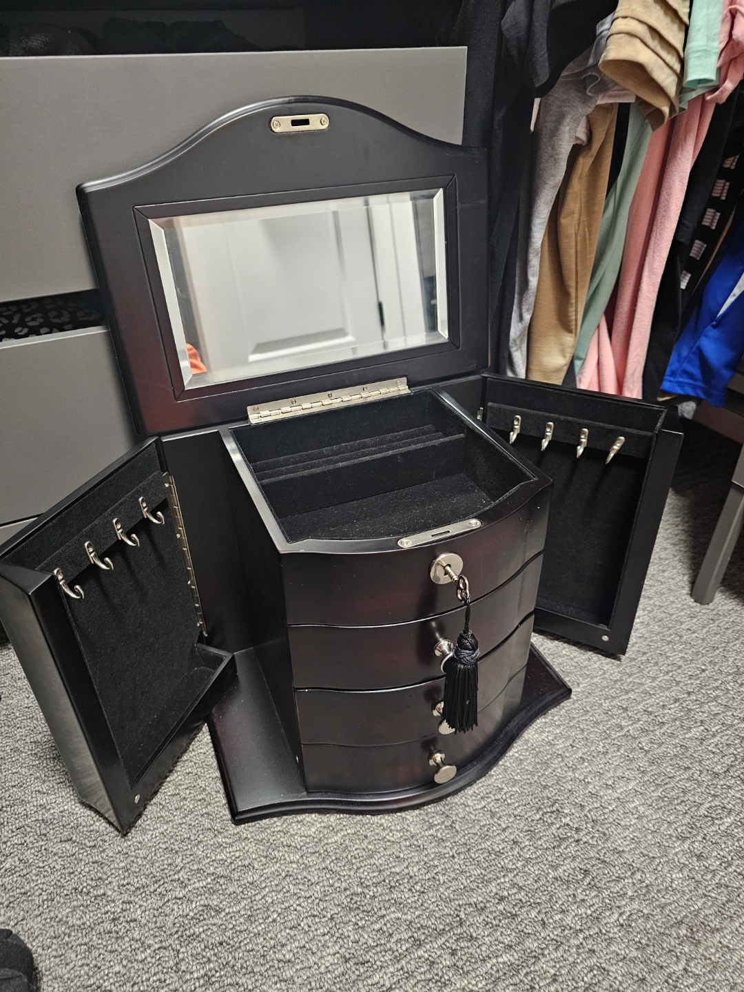 A beautiful jewellery box, black in colour. Features a lock, drawers, and hooks for hanging jewellery. A perfect place to store your most precious possessions, allowing you to feel serene and organized.