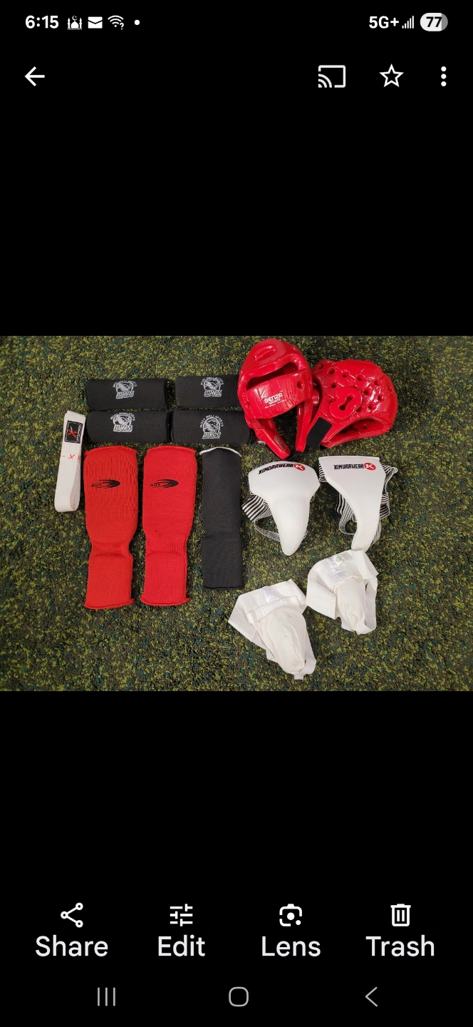 Equipment for martial arts. Items include headgear, sparring gear, and protective cups. Consider buying this gear to ensure your safety in training.