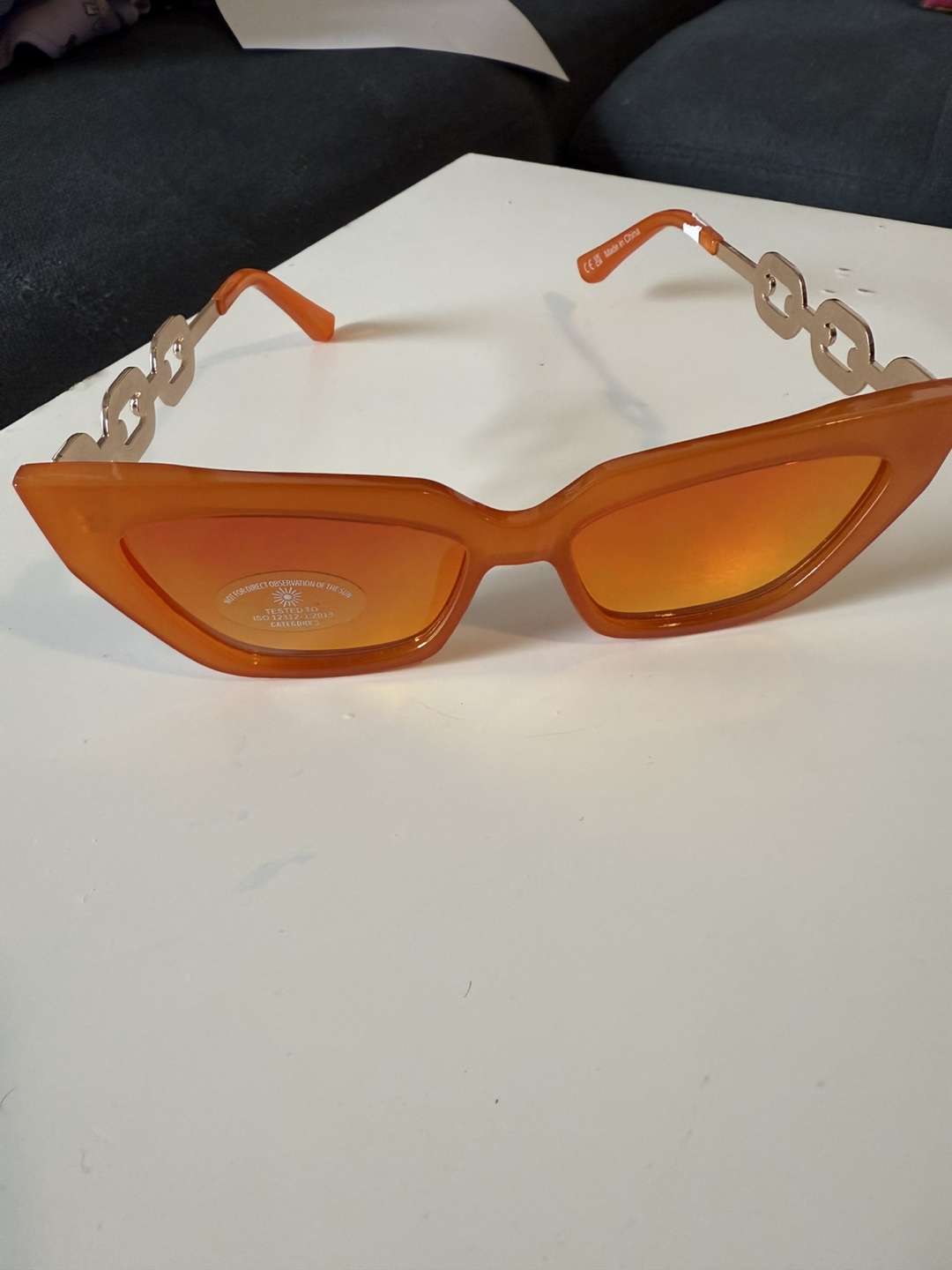 Orange sunglasses with chain-link accents on the temples. Tinted lenses. The frames are a bright orange colour. Consider these sunglasses for sunny days. It’s brand new .