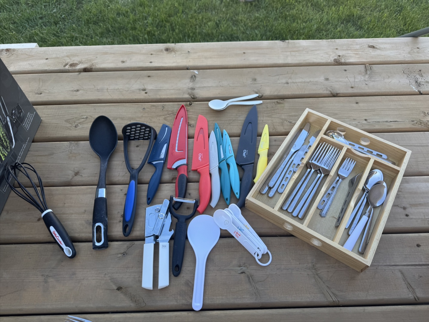 Set of kitchen utensils, knives, and cutlery. Included is a wooden organizer for the flatware. would be a great camping set !