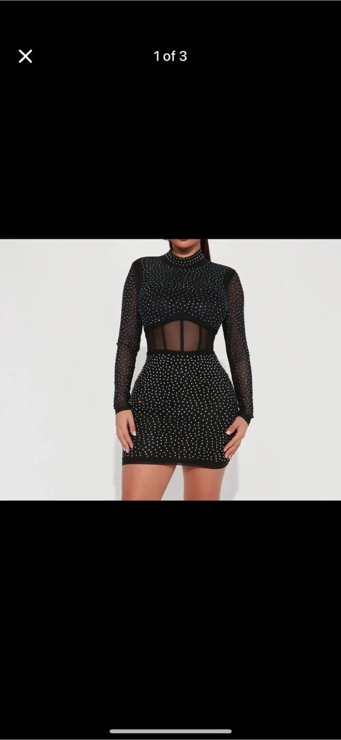 Have all 3 sizes (small,medium & large) of mini dress, embellished with rhinestones. Features long sleeves. Perfect for a night out, or a special occasion.
