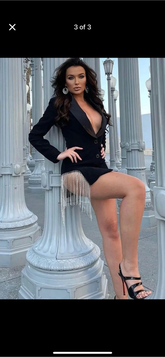 A black blazer dress with a sleek, tuxedo-style design. Features a plunging neckline and long sleeves. Includes a beaded fringe detail. Pair it with your favourite heels for a confident look.