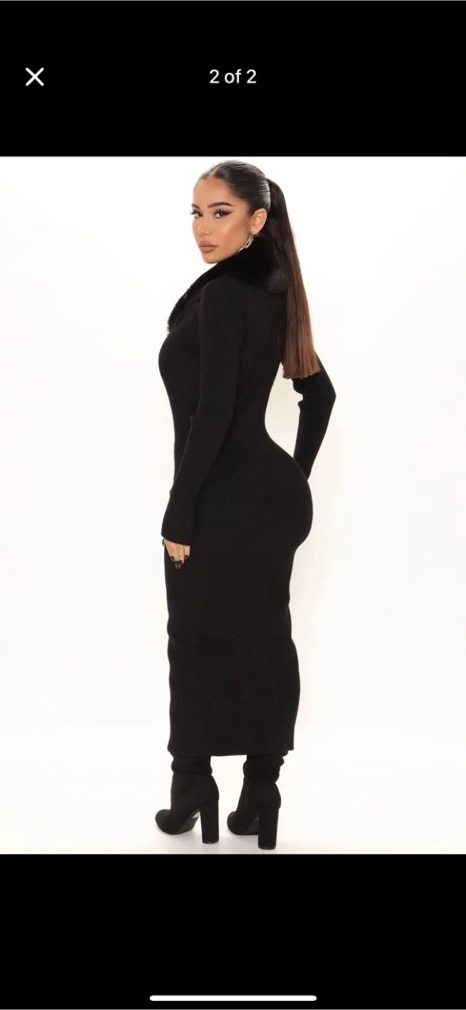 21Long sleeve knit dress. Features a fur collar. Front button closure. Perfect for an evening out, allowing you to feel calm and collected.