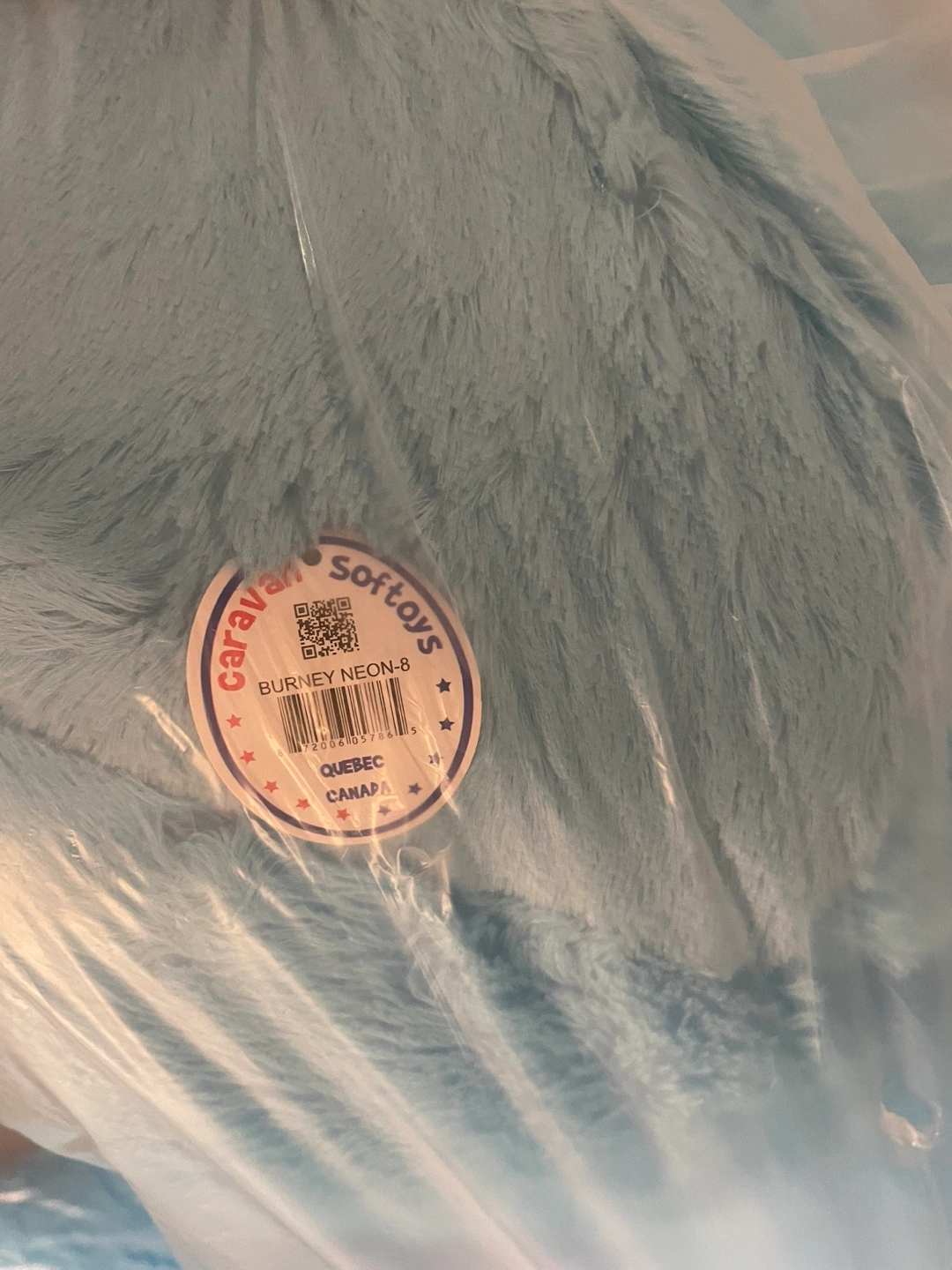 Large plush bear. Soft fur with light blue colouring. The bear is currently inside a plastic bag. It may just be what you need to snuggle up with after a long day.