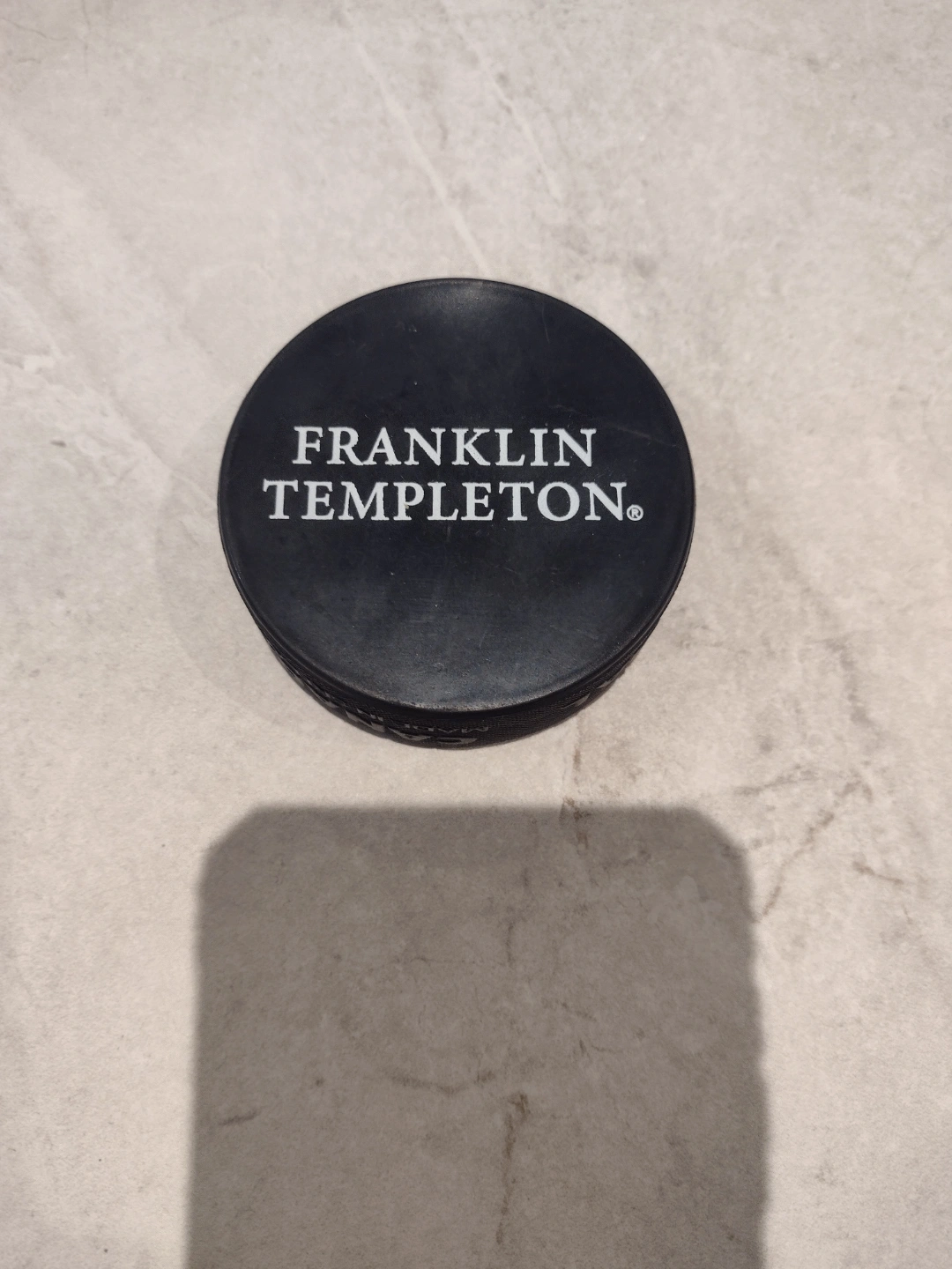 106Black hockey puck. Hockey Hall of Fame logo on one side. Franklin Templeton logo on the other side.