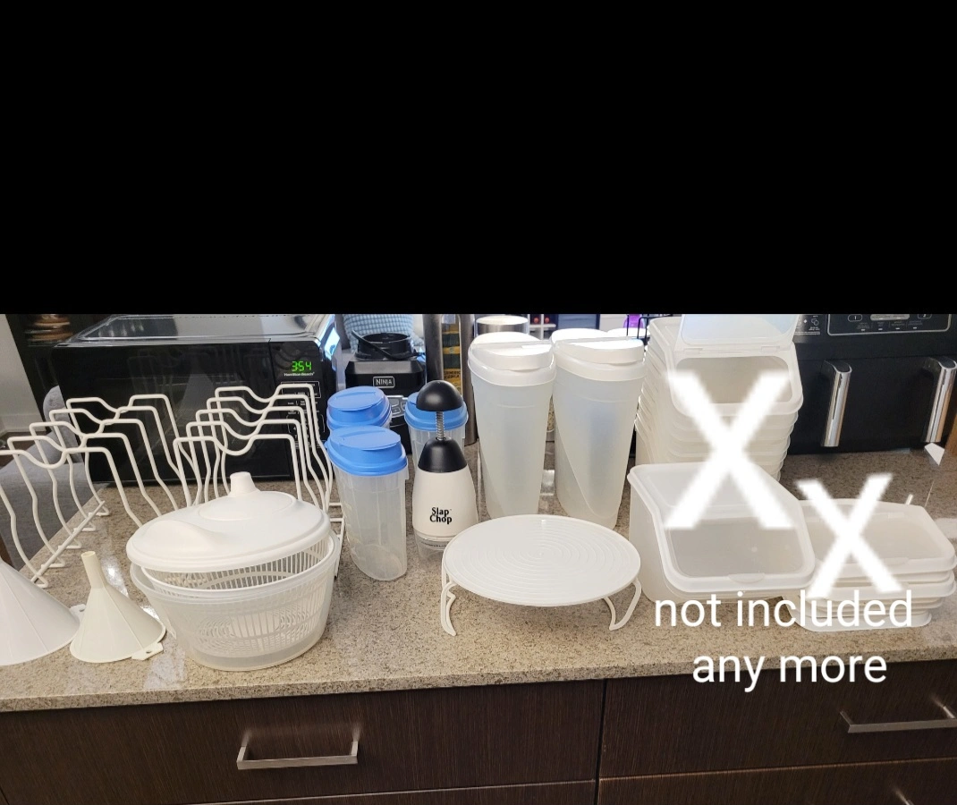 A collection of various kitchenware items. 13 pieces Includes containers of different sizes with lids. There is a salad spinner NEW. funnel, and drying racks NEW. A Slap Chop is present to help you prepare meals easier BARELY USED This set is designed to bring ease to your cooking tasks, allowing you to enjoy your time in the kitchen.