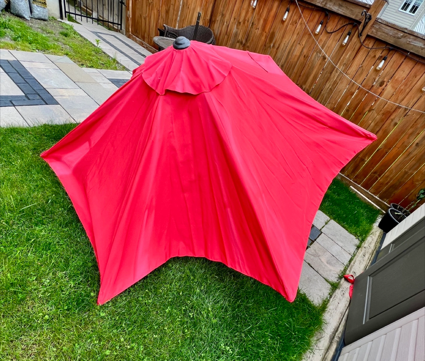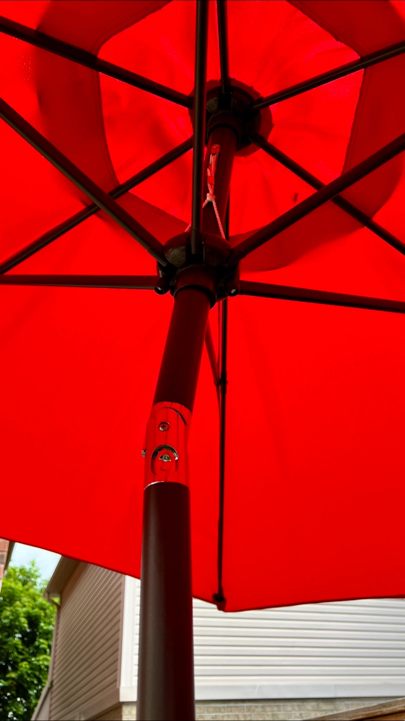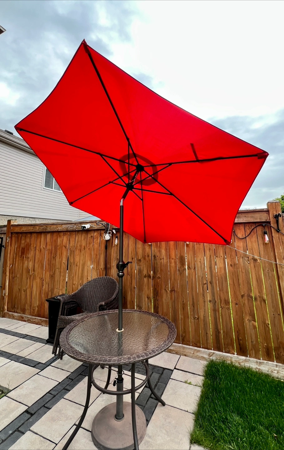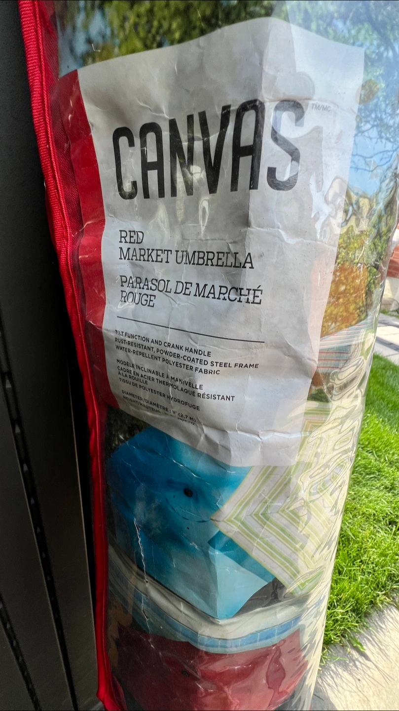 9ft red market umbrella from Canvas * Tilt function * Crank handle * Rust-resistant, powder-coated steel frame * Water-repellent polyester fabric Perfect for providing shade in your outdoor space. This umbrella is in excellent condition, ready to offer respite from the sun. Based on similar listings, I'm pricing this umbrella at $80, a fair price for its condition and features. If the ad is up, the umbrella is available; it's just waiting for you to come and claim it! No holds, sales are based on fastest pickup.