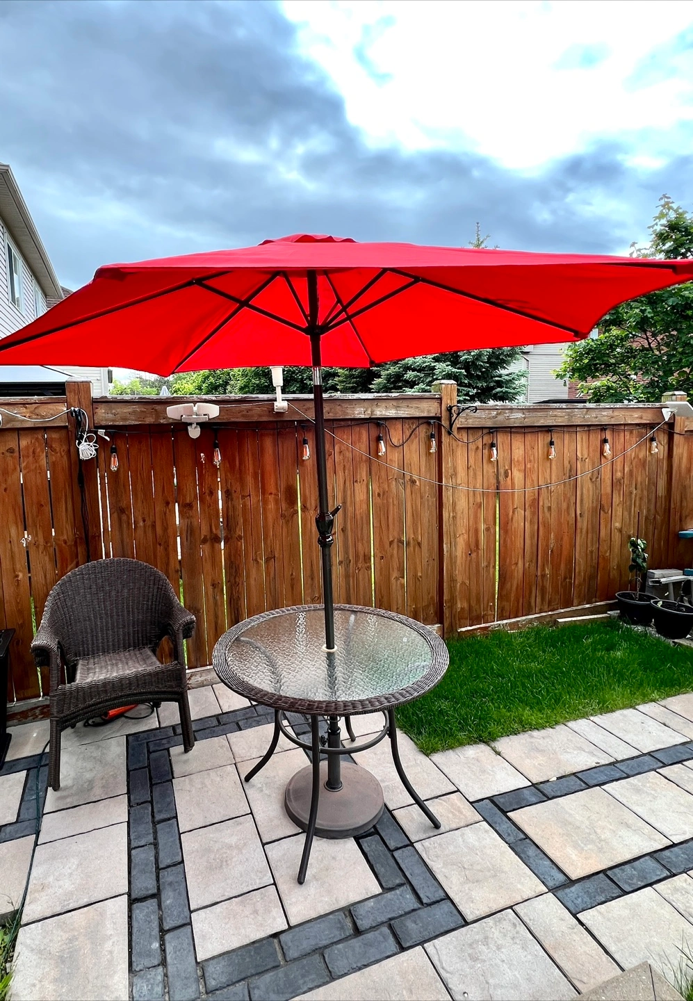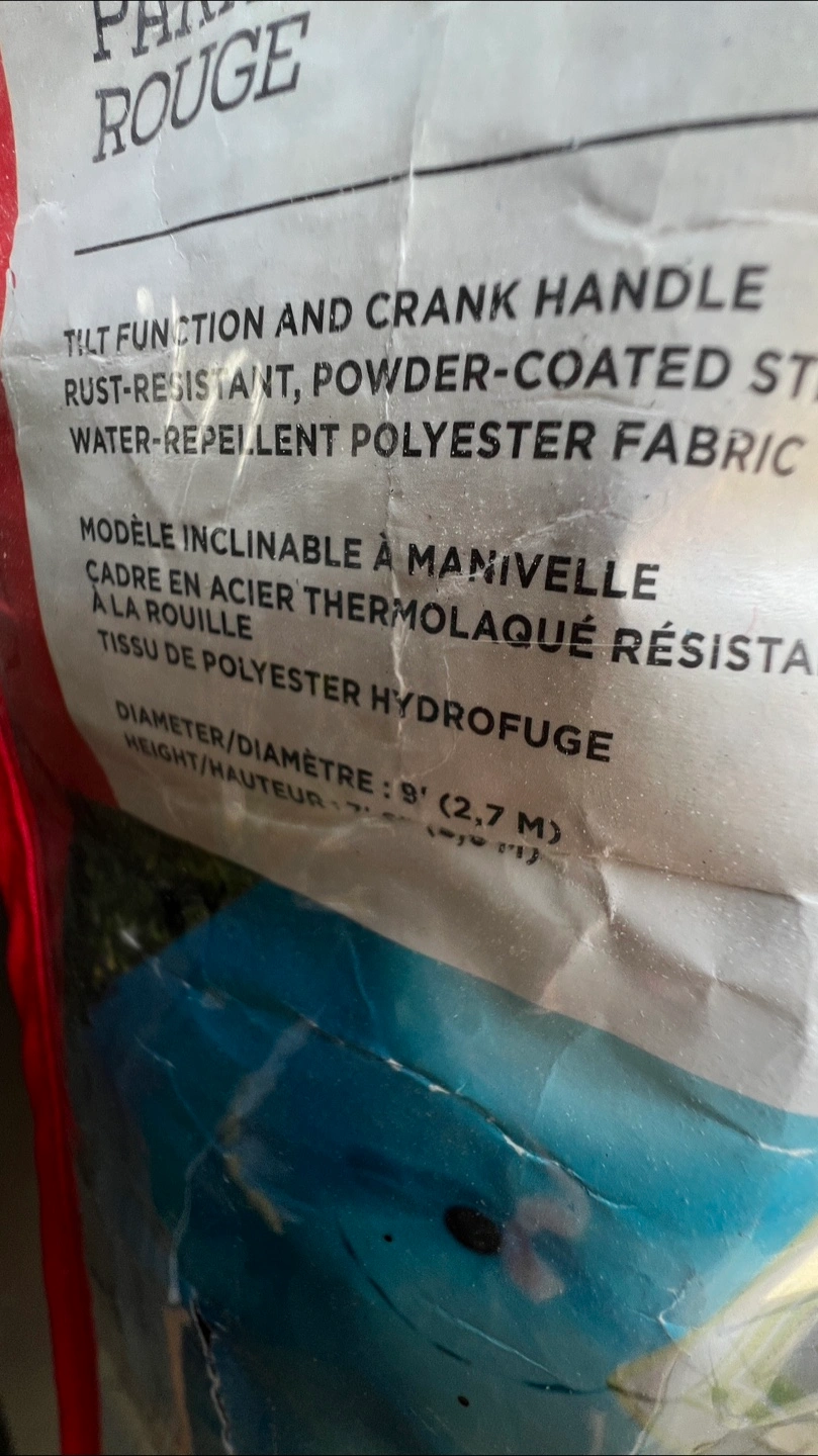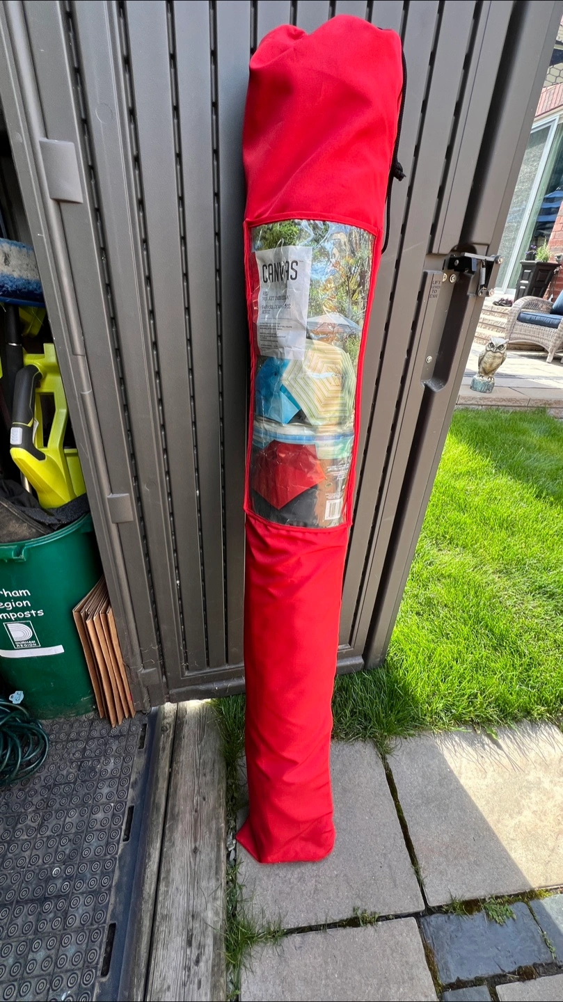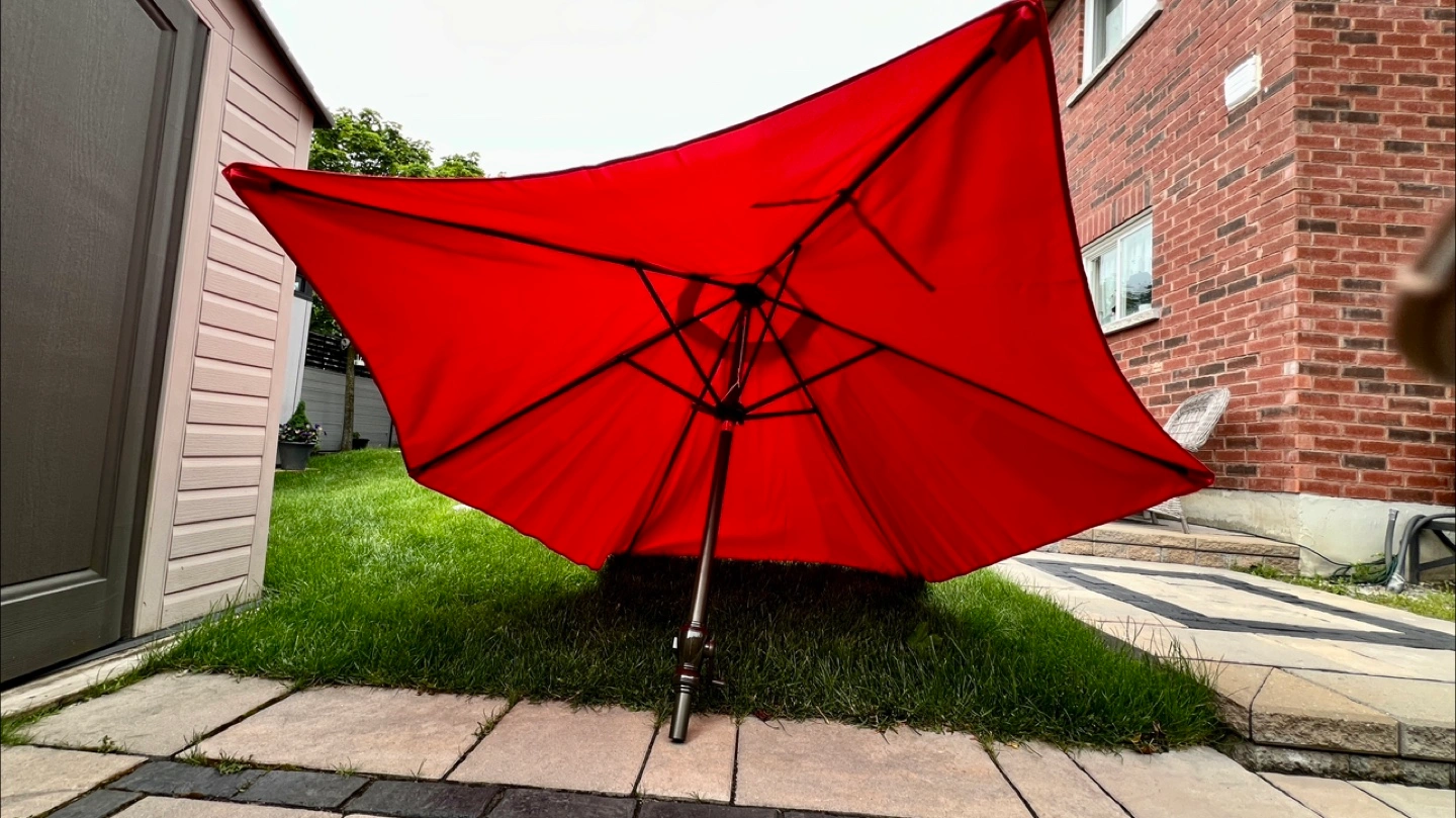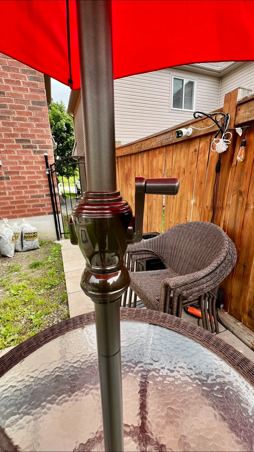 9ft red market umbrella from Canvas * Tilt function * Crank handle * Rust-resistant, powder-coated steel frame * Water-repellent polyester fabric Perfect for providing shade in your outdoor space. This umbrella is in excellent condition, ready to offer respite from the sun. Based on similar listings, I'm pricing this umbrella at $80, a fair price for its condition and features. If the ad is up, the umbrella is available; it's just waiting for you to come and claim it! No holds, sales are based on fastest pickup.