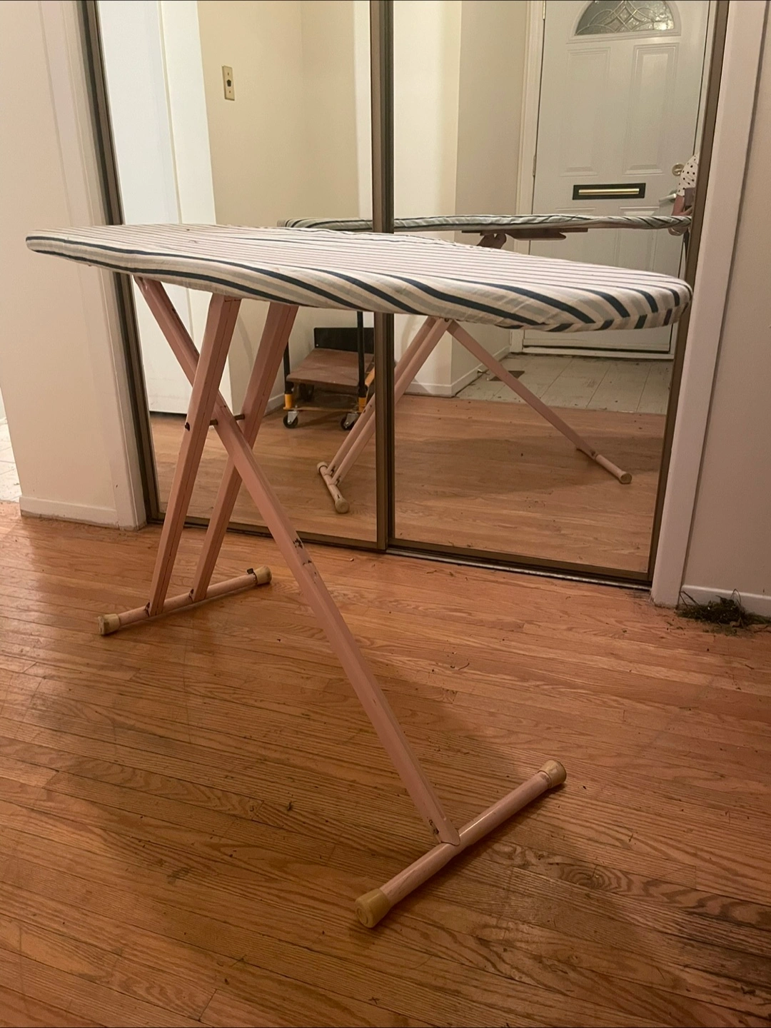 Features a pink metal frame and striped fabric. Folds for easy storage. Provides a convenient surface for your ironing tasks.