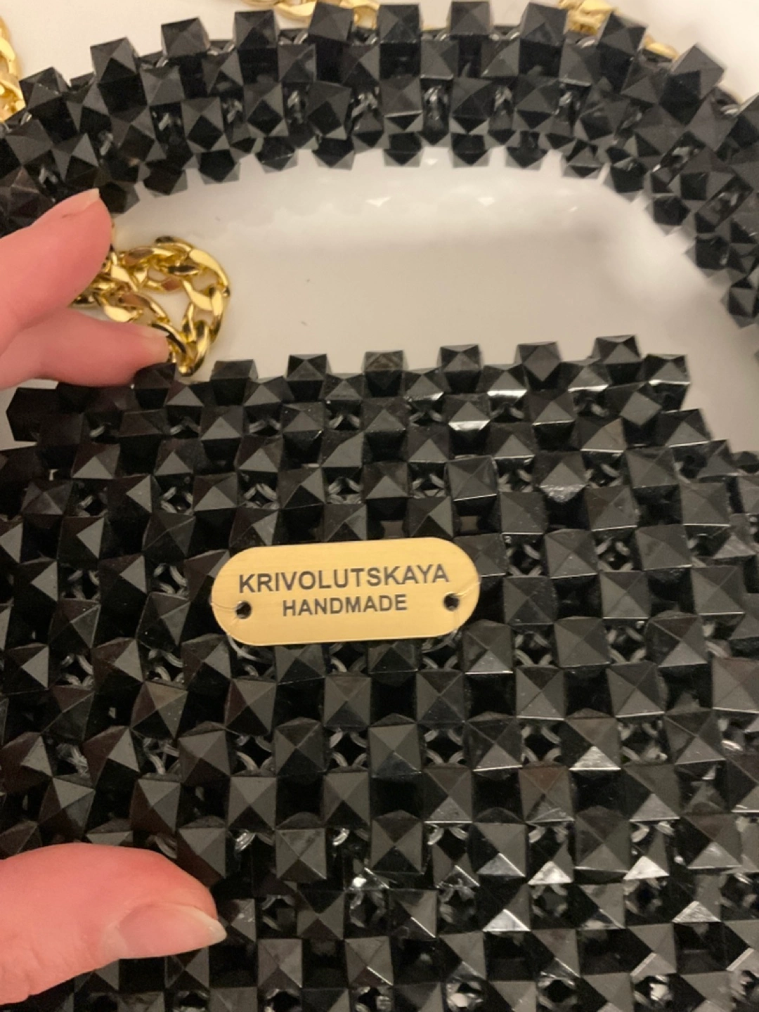 Very high quality and handmade work. Features a detachable gold chain and a handle. The handbag has a small gold-colored nameplate. Consider this as a nice addition to an outfit, to give it a bit of an edge.