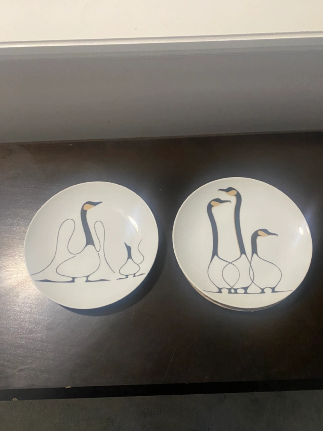 Plates with a goose design. White background. Sold in sets. Would be great for adding a touch of tranquility to your dining experience.