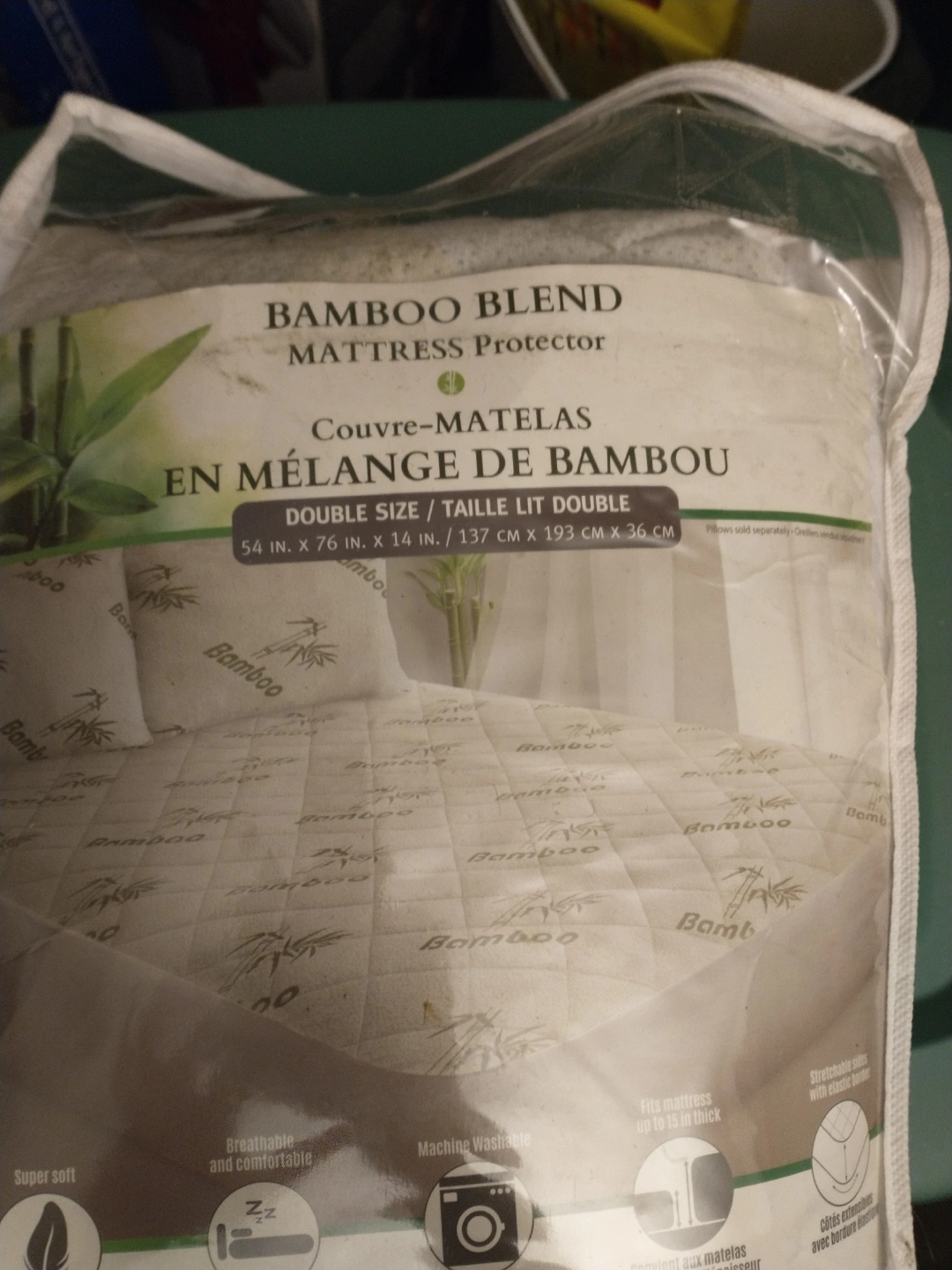 BAMBOO BLEND MATTRESS PROTECTOR, FULL OR DOUBLE SIZE. I BOUGHT THIS OFF FACEBOOK MARKETPLACE A COUPLE OF YEARS AGO, NEVER USED IT. OPENED IT UP THERE IS ONE STAIN, DIDN'T SEE ANY OTHERS. PERFECTLY GOOD, PRICE FIRM JUST TRYING TO GET BACK WHAT I PAID FOR IT. WAS TOLD IT WAS ONLY USED FOR FIVE OR SIX MONTHS.