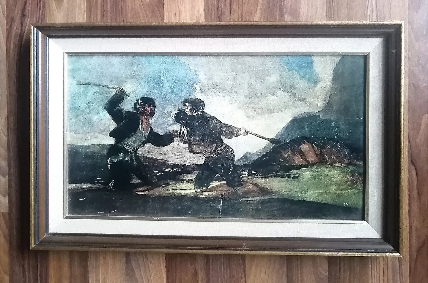Artwork, framed in a decorative frame. The painting in the image is "Fight with Cudgels" by Francisco Goya, created between 1820 and 1823 as part of his "Black Paintings" series.