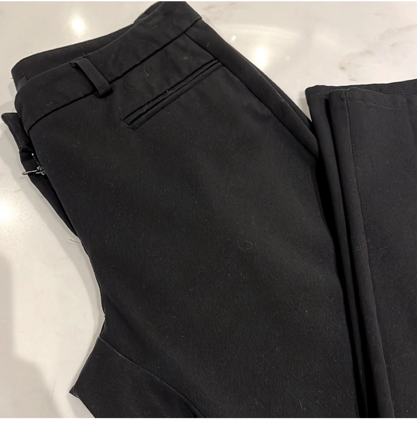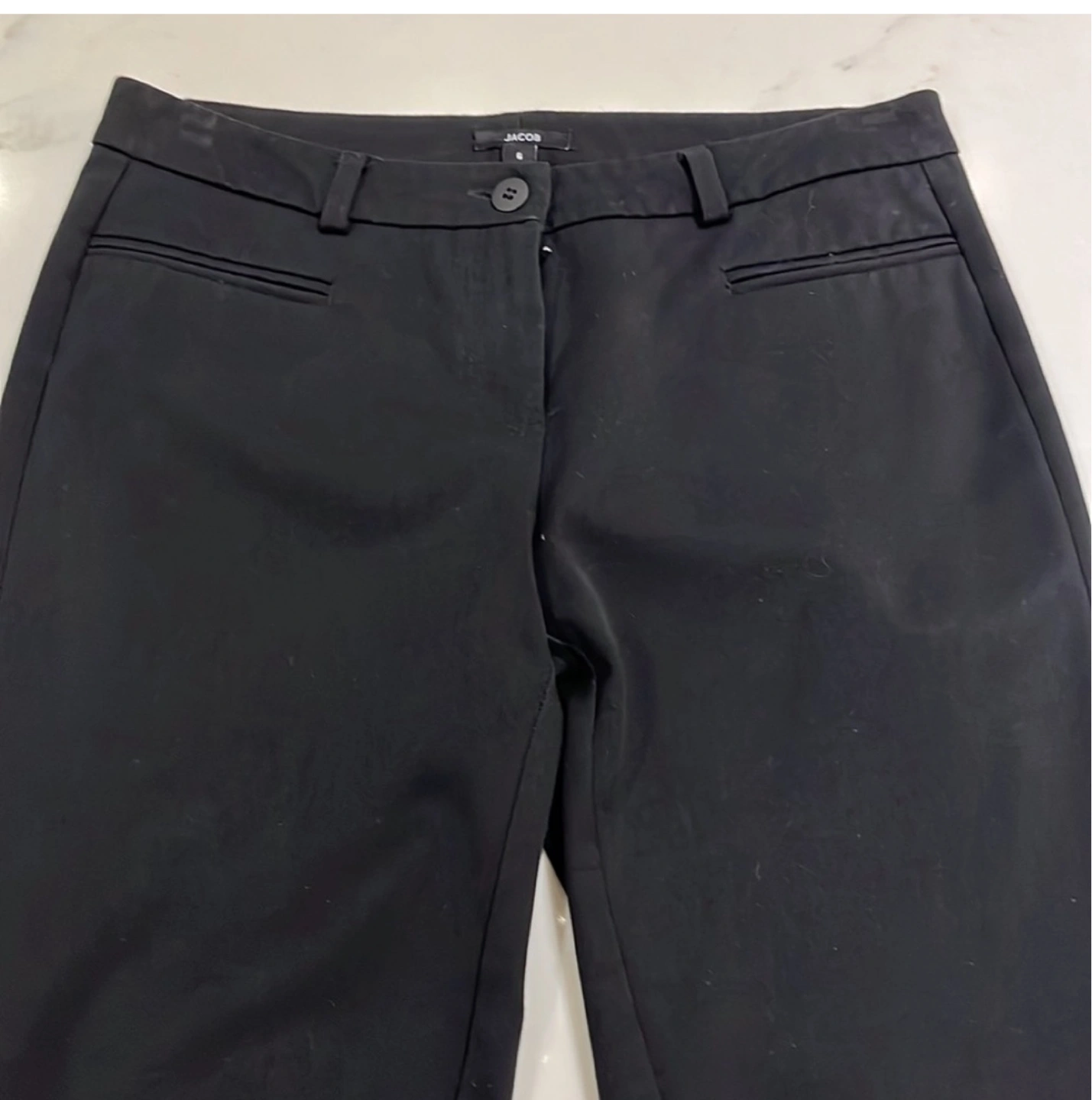Black dress pants. Slit pockets at the front. A great addition to any outfit. Consider these the perfect item to help you unwind at the end of a long day