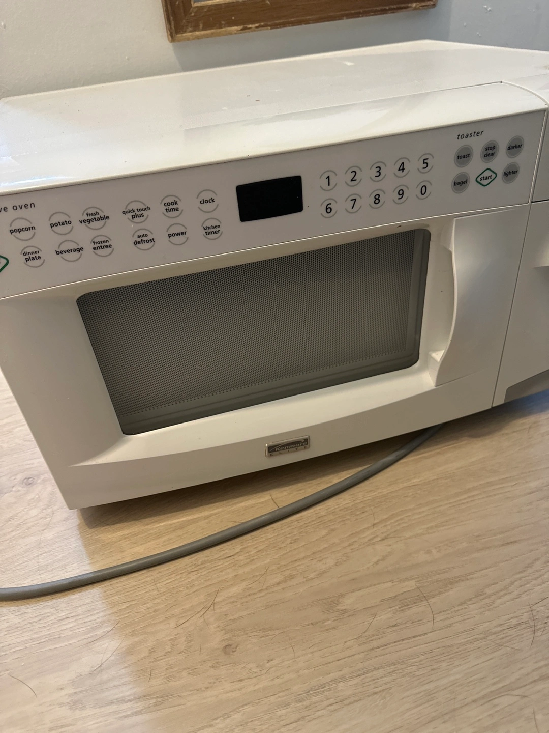 White appliance with a microwave and toaster combination. Includes a number pad with various preset options. Use this appliance to make yourself a quick and easy meal, or just heat up some leftovers and relax.
