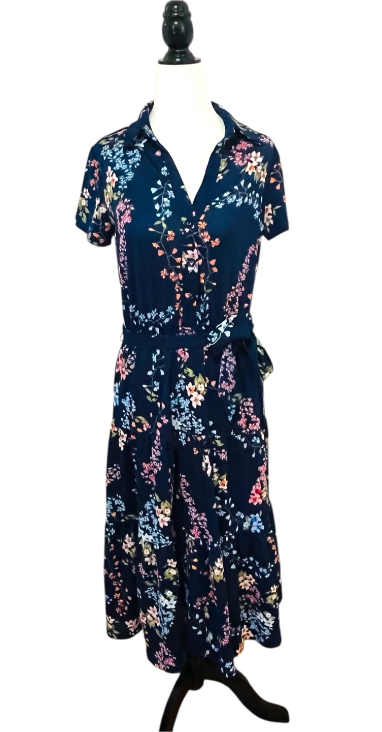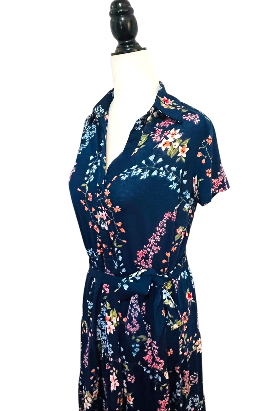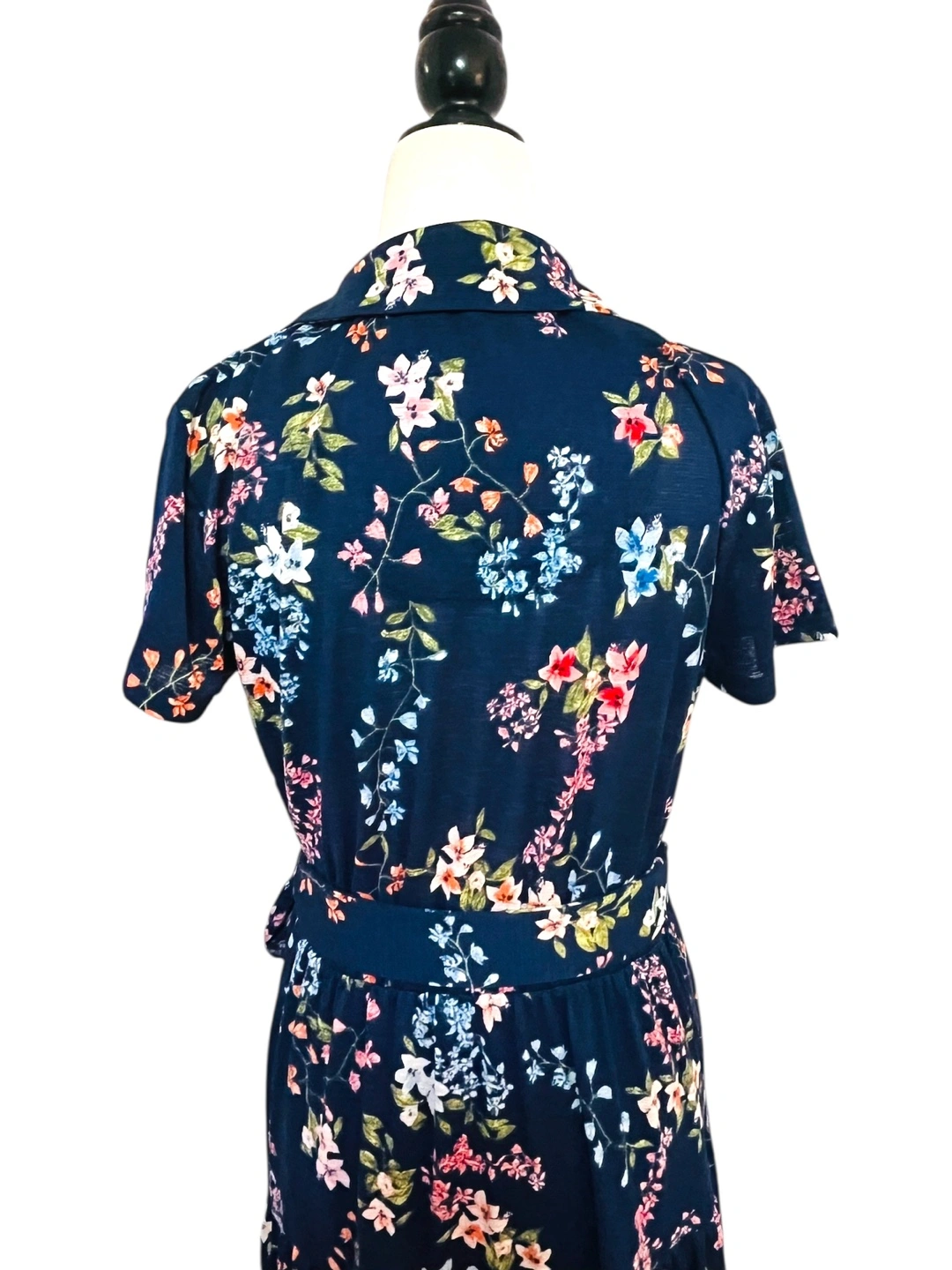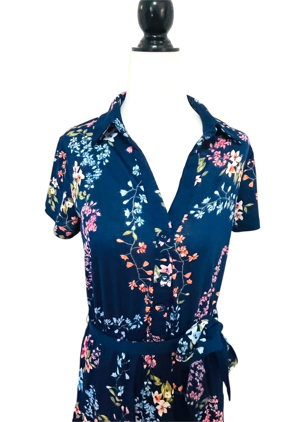 Keywords: floral midi dress, short sleeve dress, belted dress, casual dress, navy dress, women's dress, spring dress, summer dress, bohemian dress, boho chic, floral print, midi dress, collared dress, button down dress