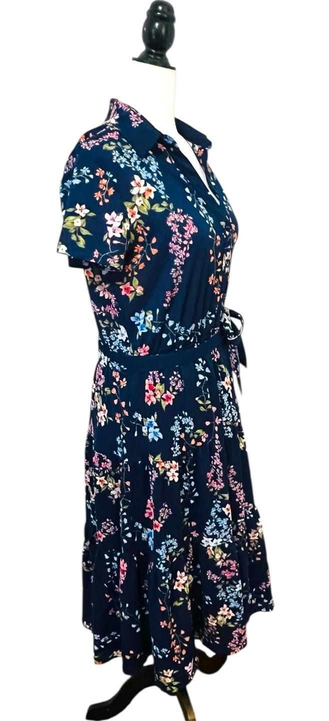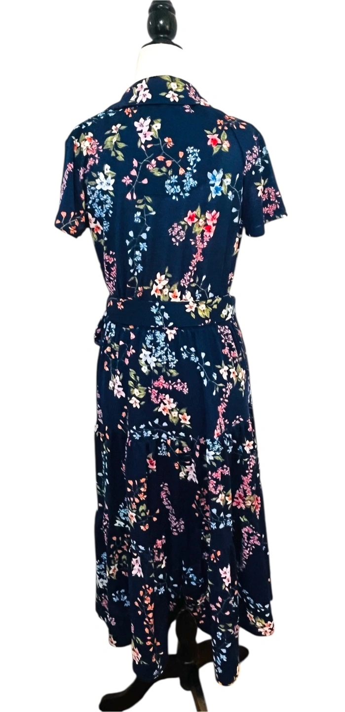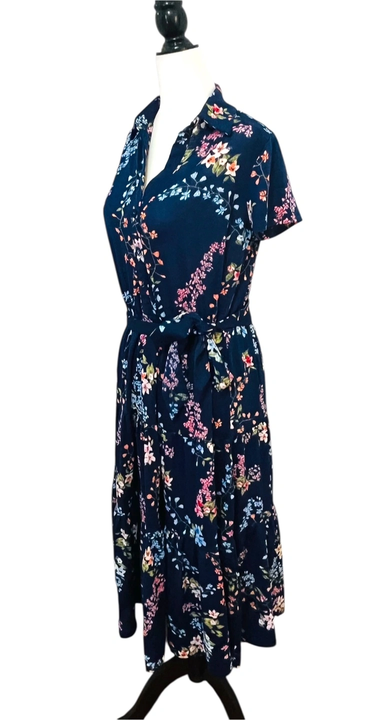 A cascade of blossoms adorns this charming midi dress, perfect for adding a touch of effortless elegance to your wardrobe. The dress features a flattering collared neckline that flows into a button-down bodice, cinched at the waist with a matching tie belt to accentuate your figure. The short sleeves offer a comfortable and breezy feel, while the midi length provides a sophisticated silhouette. The all-over floral print in a medley of colors against a navy backdrop creates a visually stunning and versatile piece. Imagine yourself wearing this dress to a garden party, a casual brunch with friends, or a relaxed afternoon of shopping.