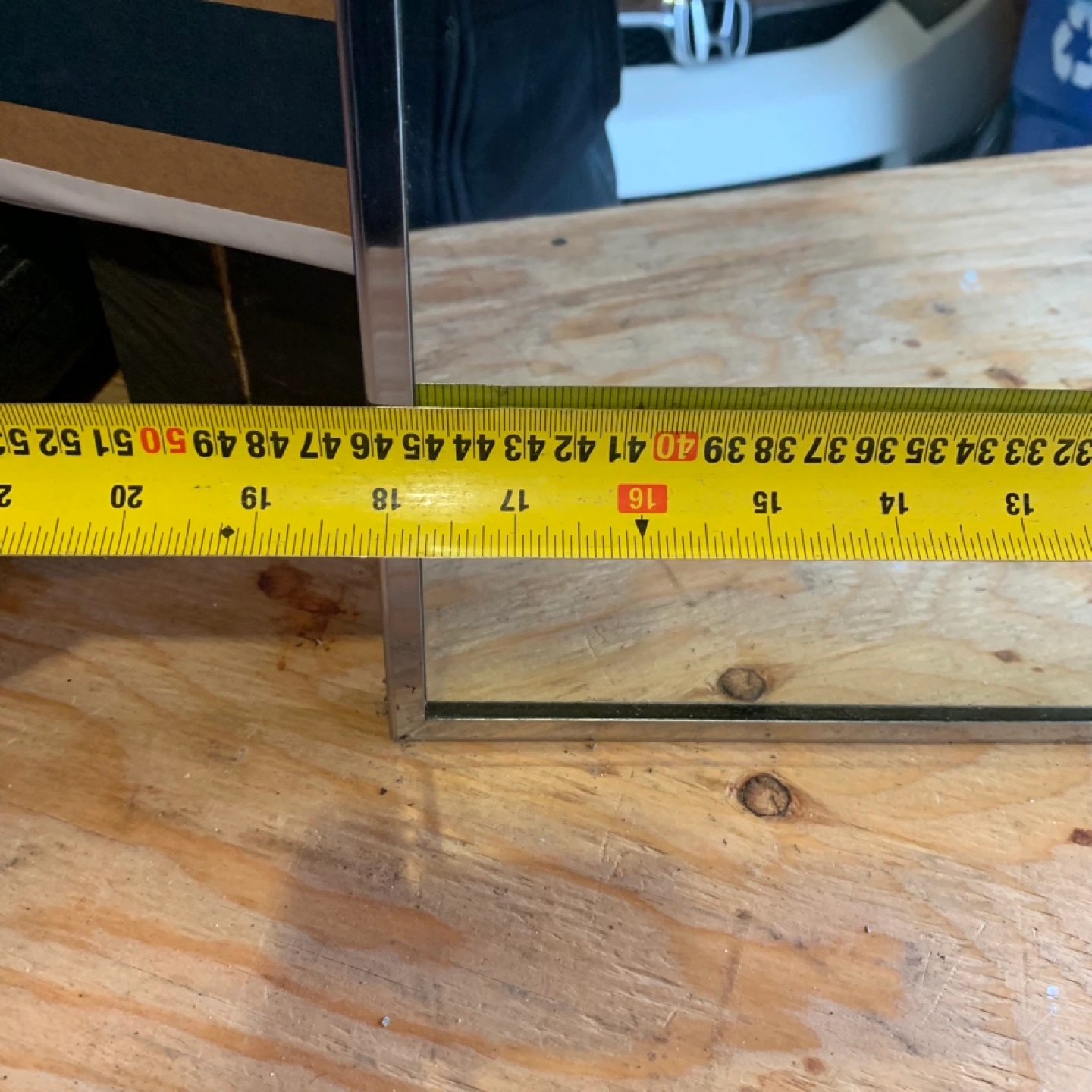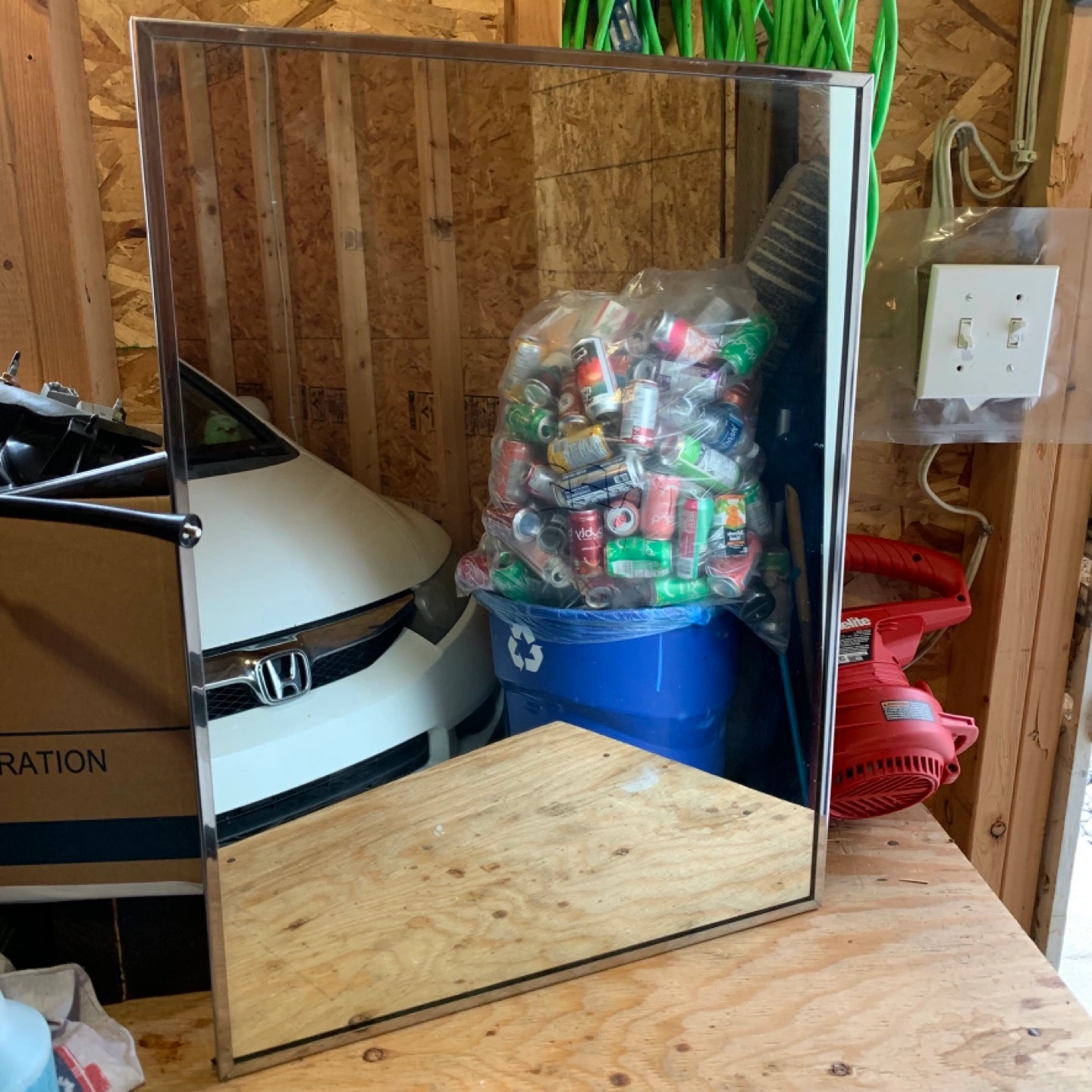 Heavy duty mirror with a thin metal frame. The frame is silver in colour. The back of the mirror appears to be metal and has four screw mounts. Enjoy it as a peaceful way to check your reflection or to create a larger space in your room. width-18inch, Length-24inches