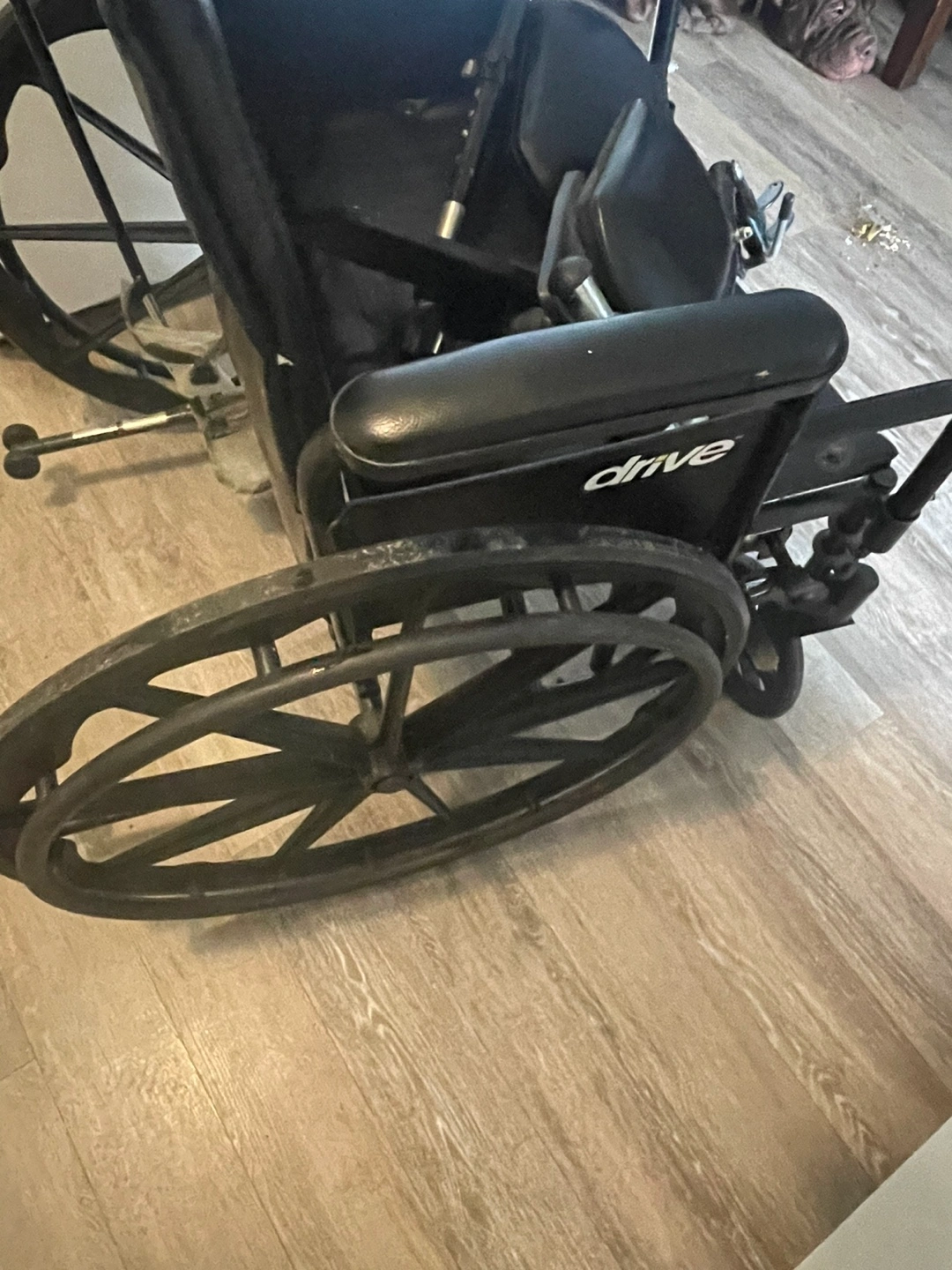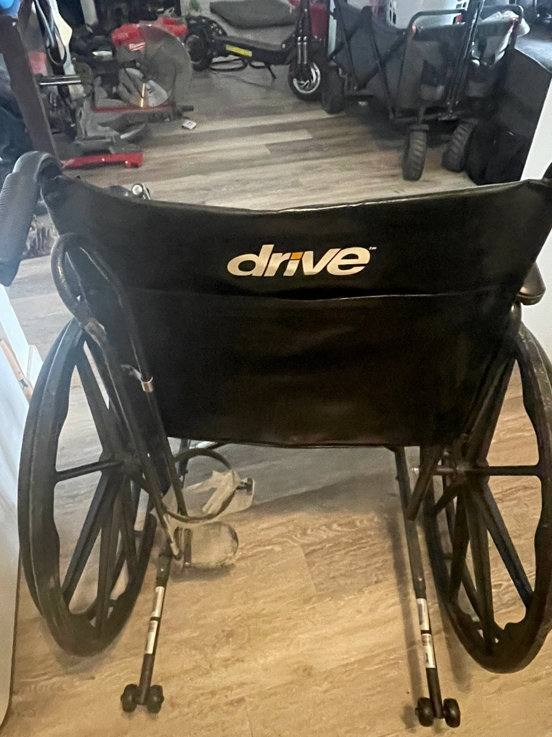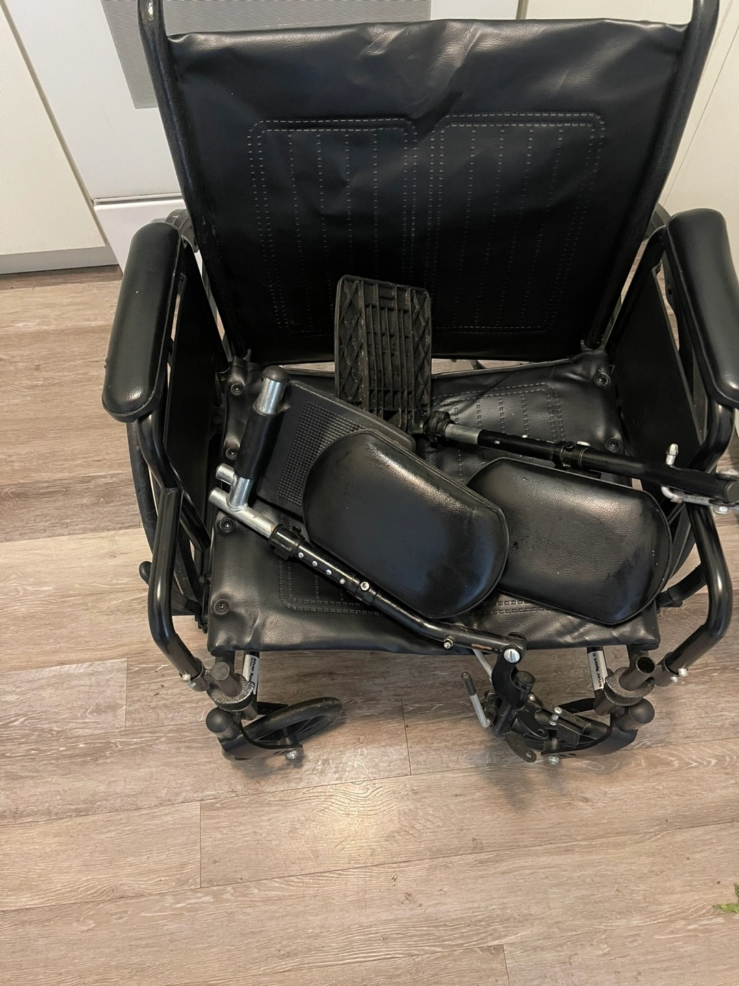 Black wheelchair. Large back wheels. Adjustable footrests. A great way to enjoy some peaceful time outside.