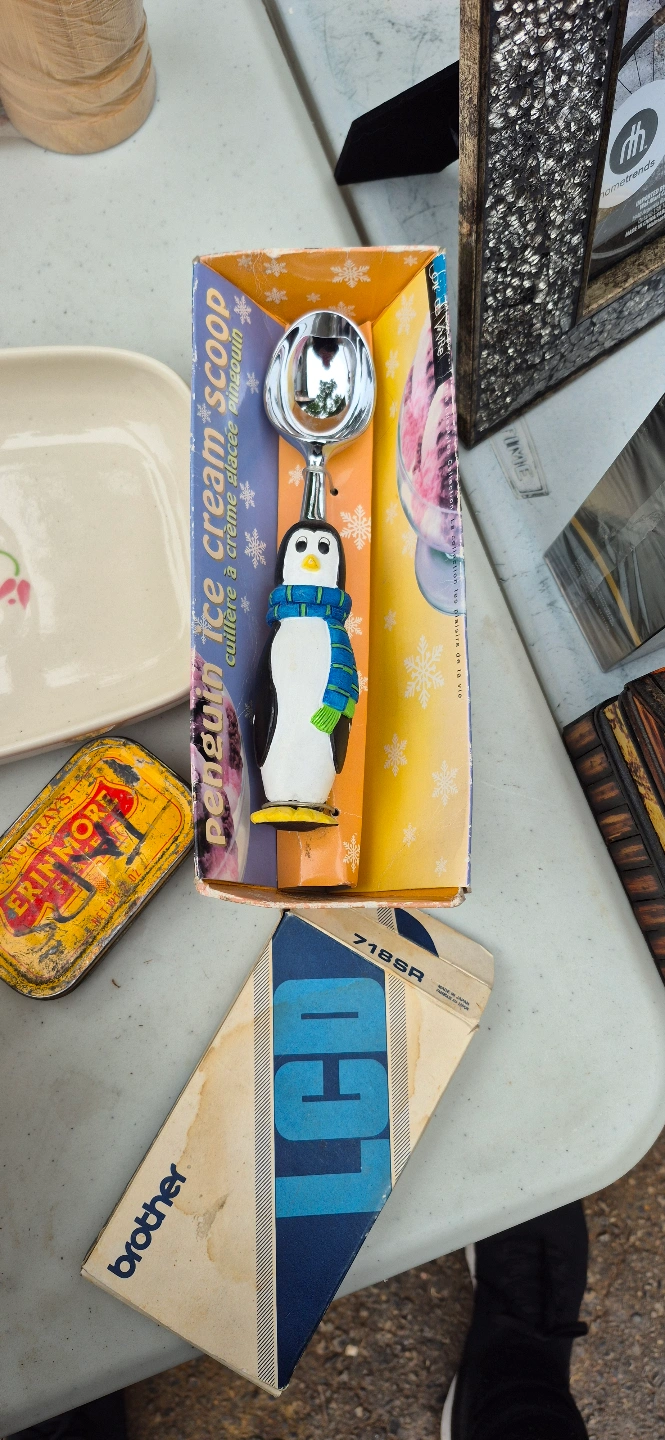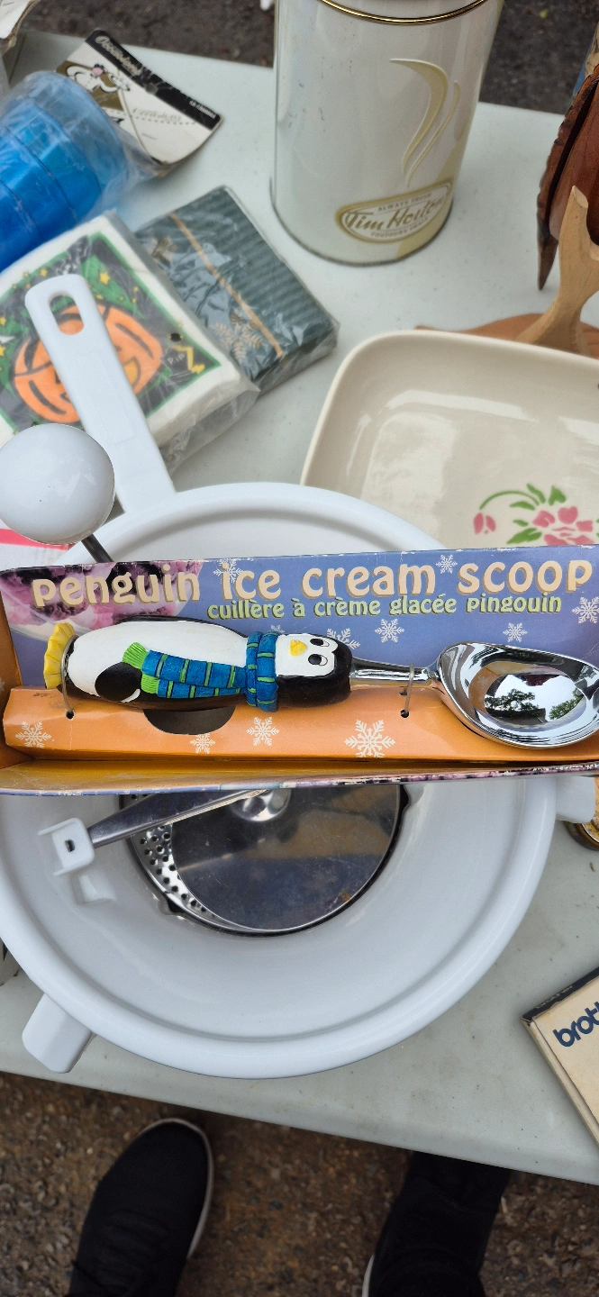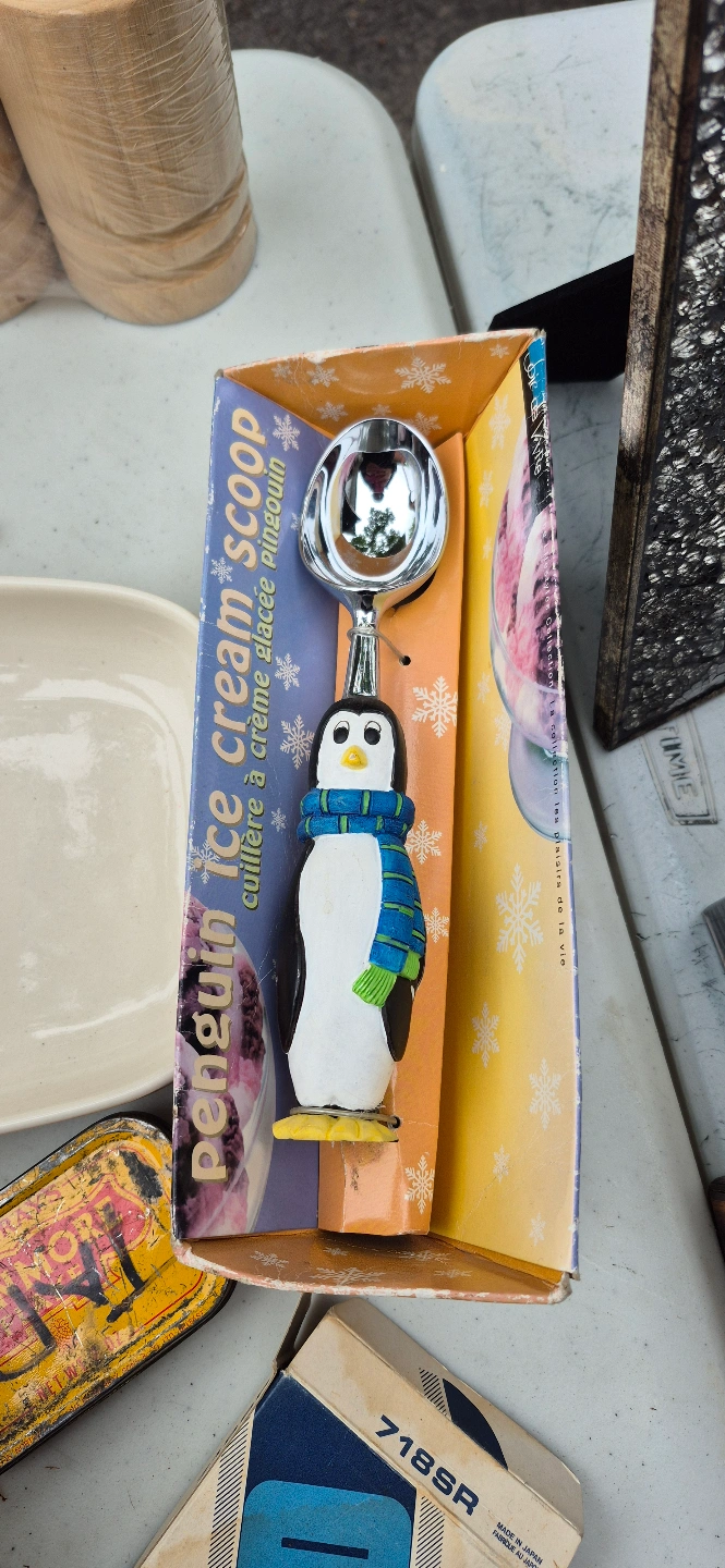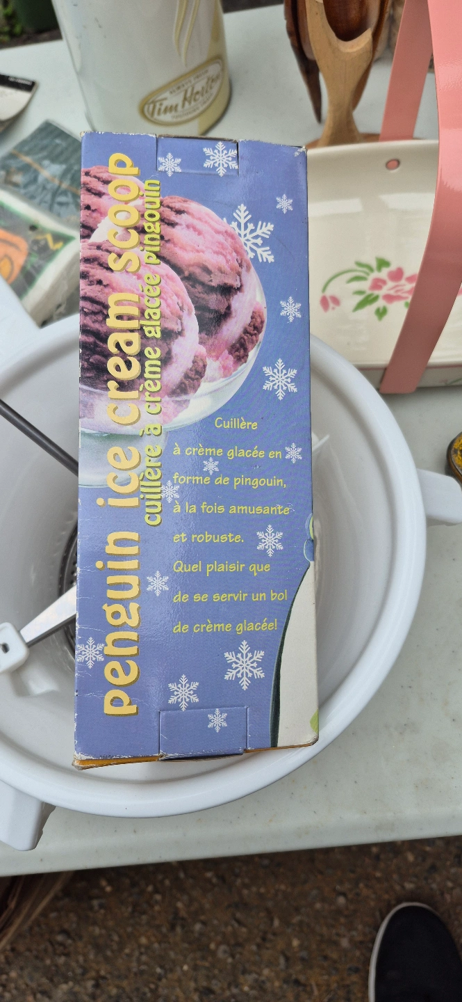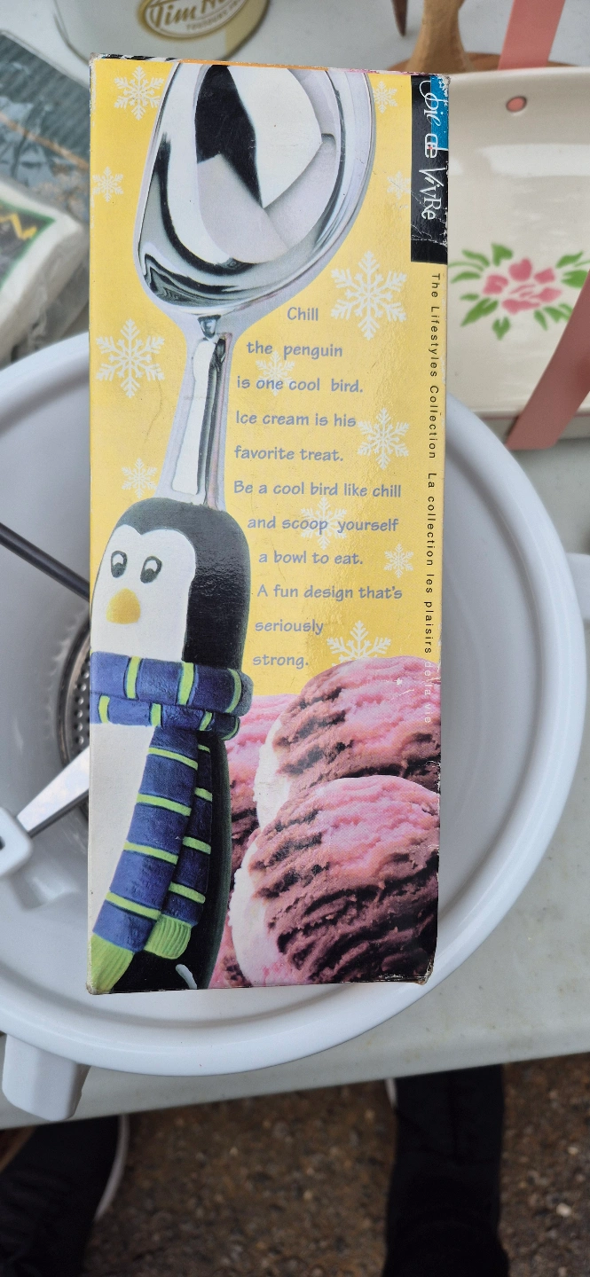 This Vintage ice cream scoop has a fun penguin design. The scoop is inside its original packaging. Enjoying a scoop of ice cream can be a moment of pure bliss.