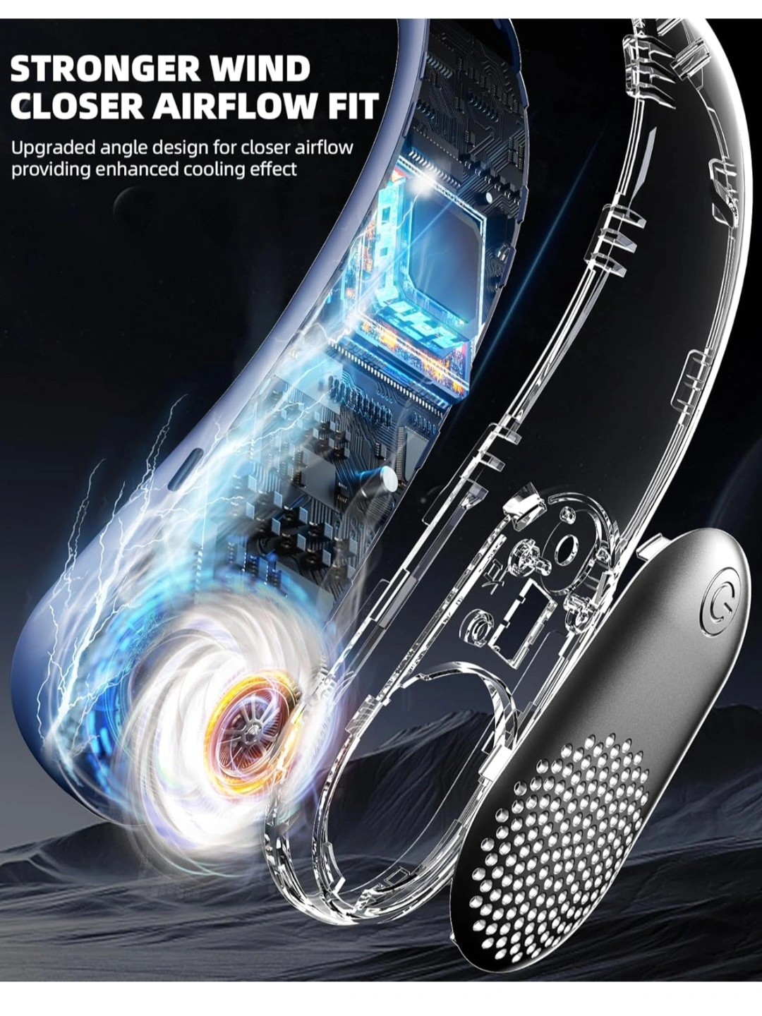 It has multiple speed settings. Provides 360° surrounding air flow. All day cooling with one charge. The neck fan can be a lifesaver on a hot day.