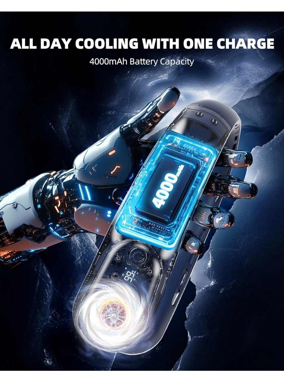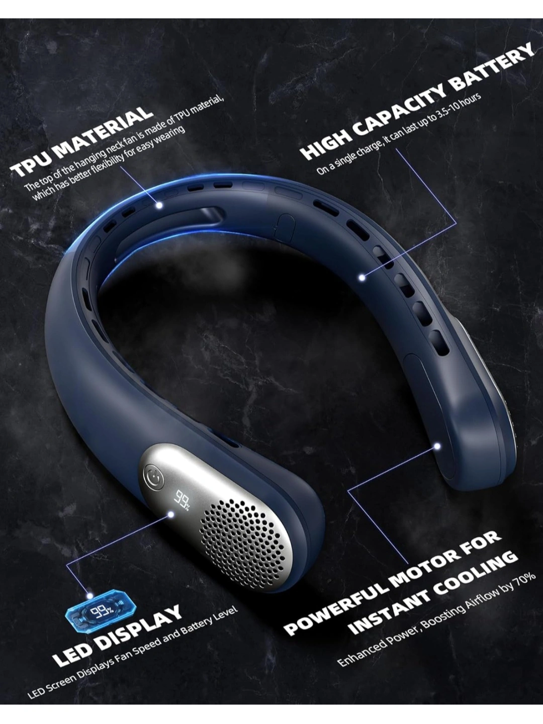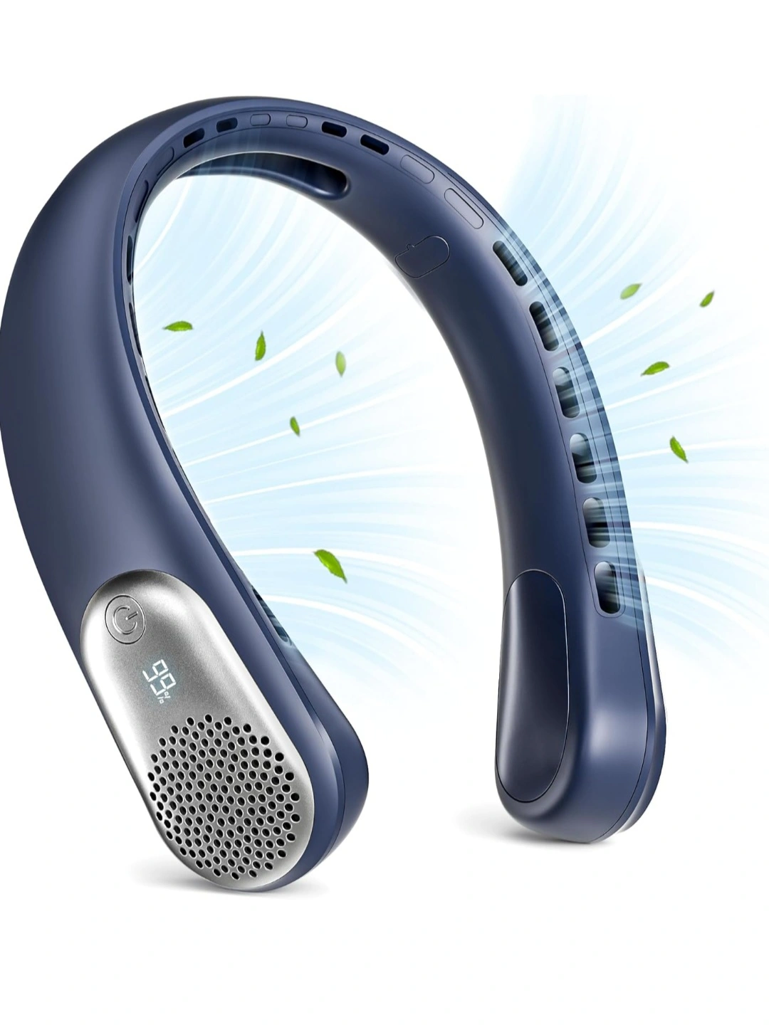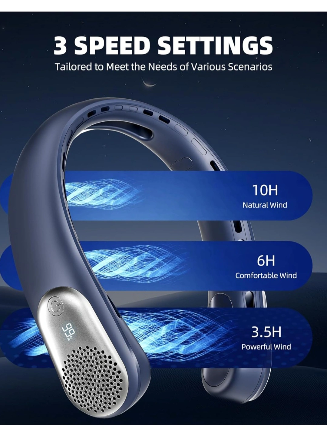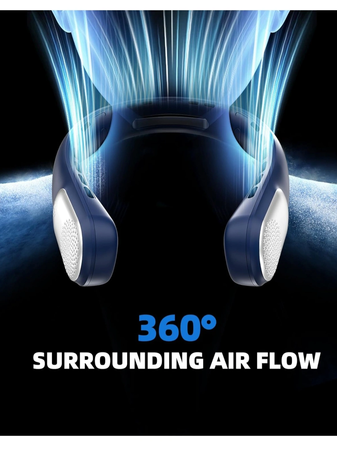 It has multiple speed settings. Provides 360° surrounding air flow. All day cooling with one charge. The neck fan can be a lifesaver on a hot day.