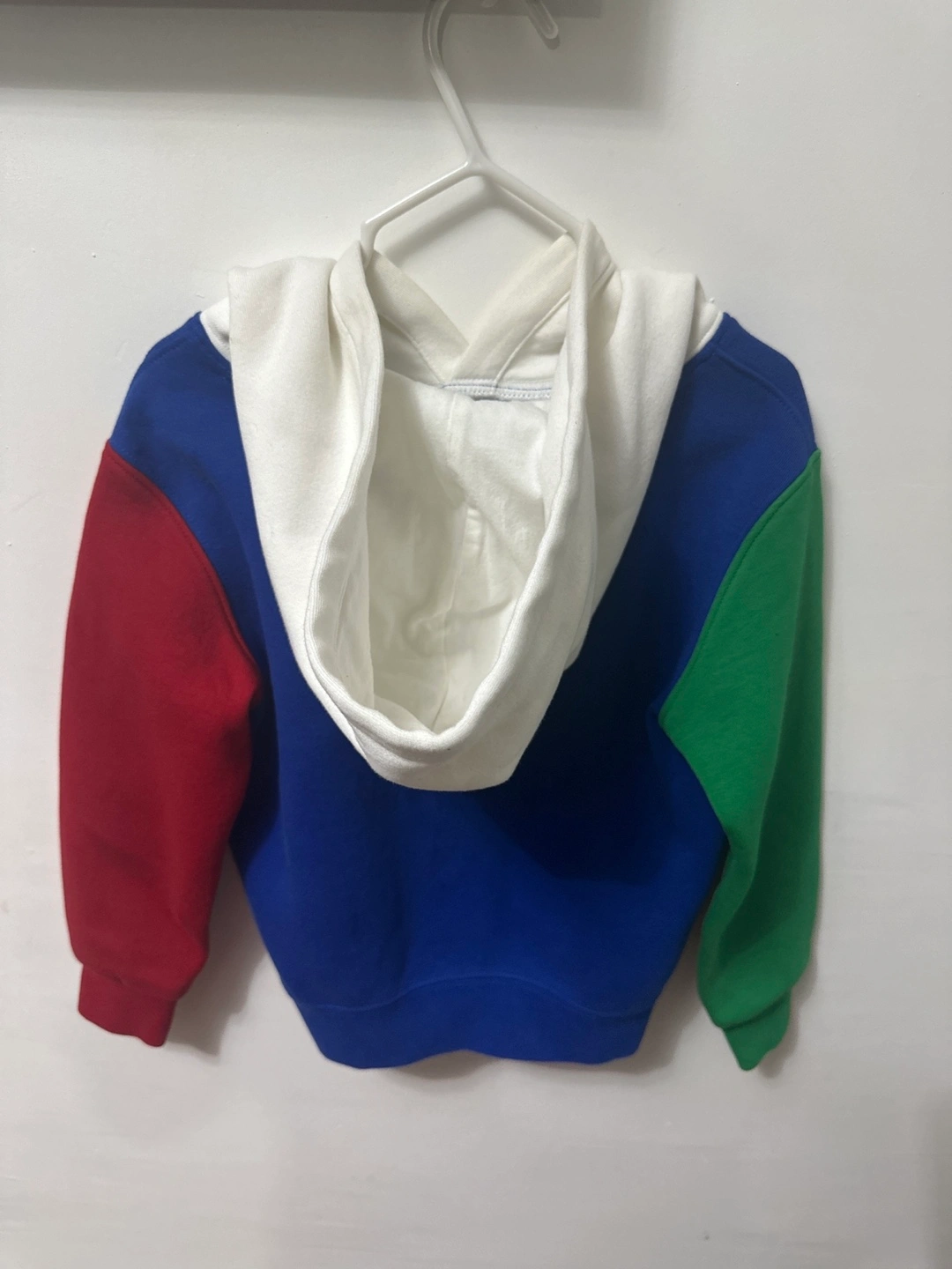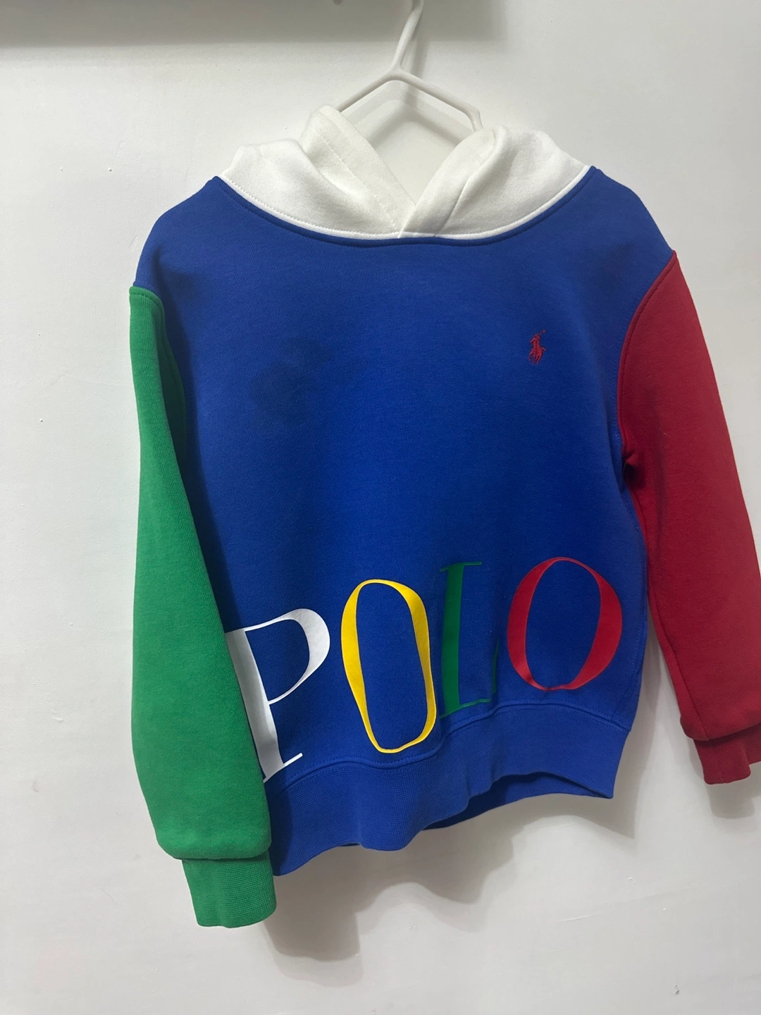 Multicolored sweatshirt with a white hood. Features the word 'POLO' across the front. Poli ralph lauren for little boy size 5
