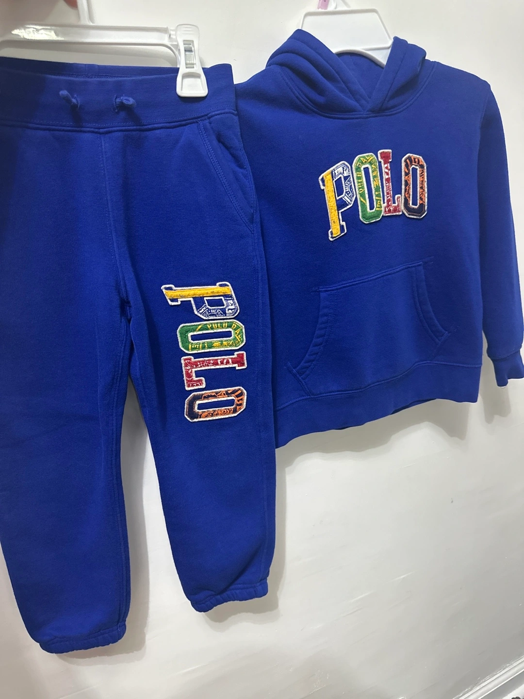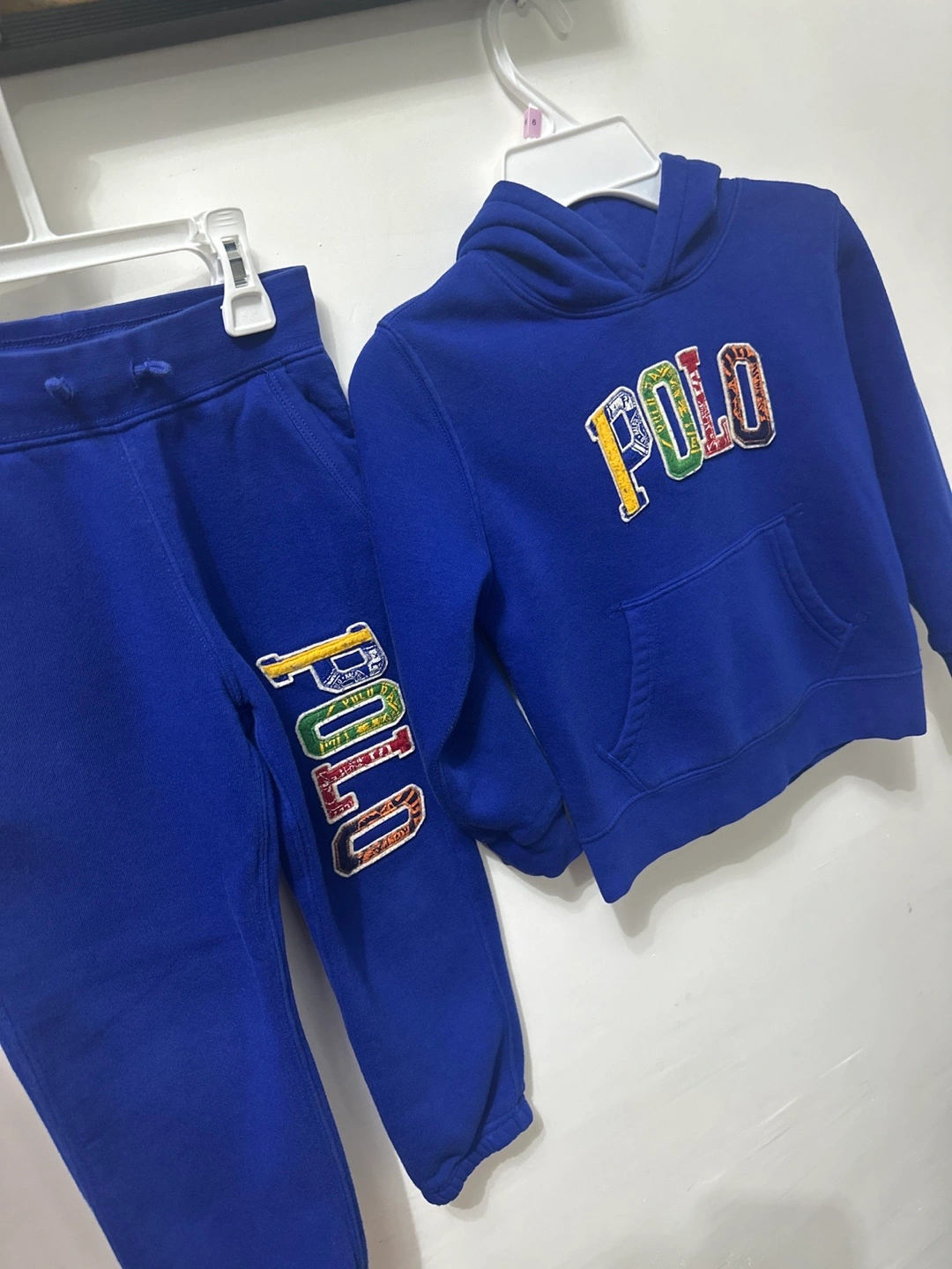 Blue sweatsuit. Includes a hoodie and matching pants. Both pieces feature a Polo Ralph lauren logo for little boy size 5