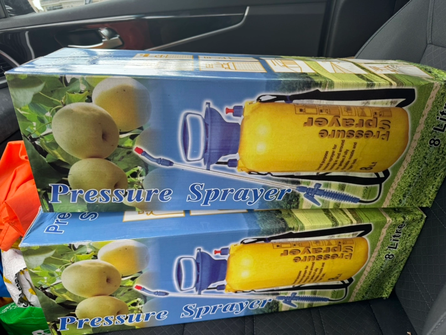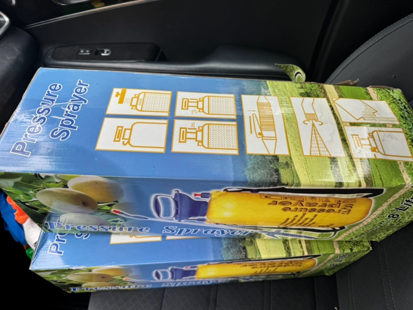 Boxed pressure sprayer. Depicts pictures of a sprayer. Box includes information and directions. A pressure sprayer can bring a peacefulness while tending to your garden.