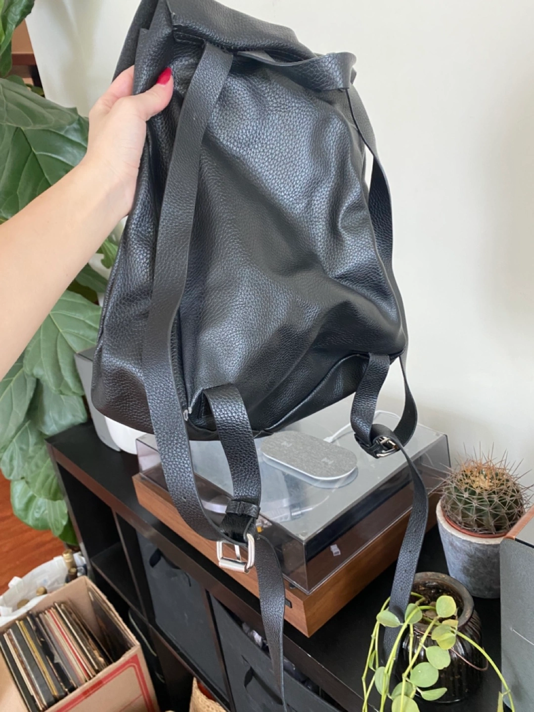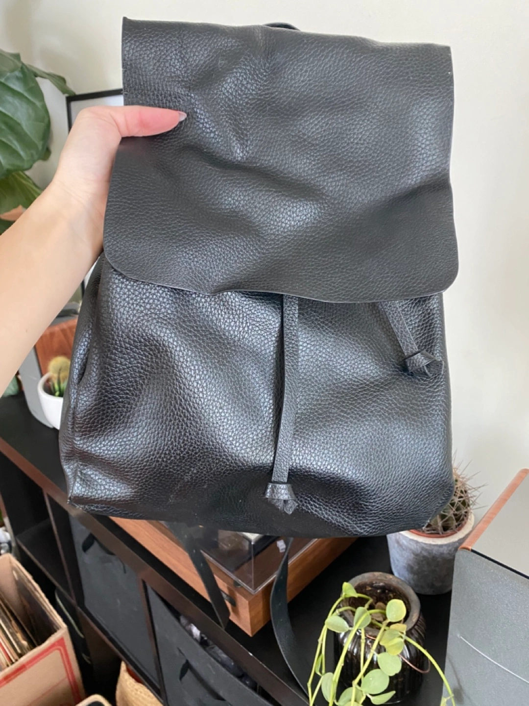 Black pleather backpack w Drawstring closure. Adjustable straps. Made of leather? Expandable and stylish! Wear on edges