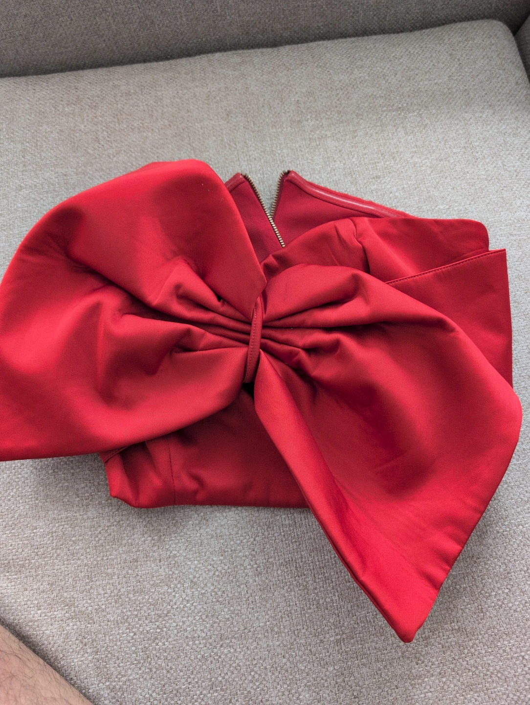 Red top with a large bow at the front. Featuring a zipper at the back. Made of polyester material. A wonderful item for special occasions. collect near downtown distillery.. great for parties and outdoors...