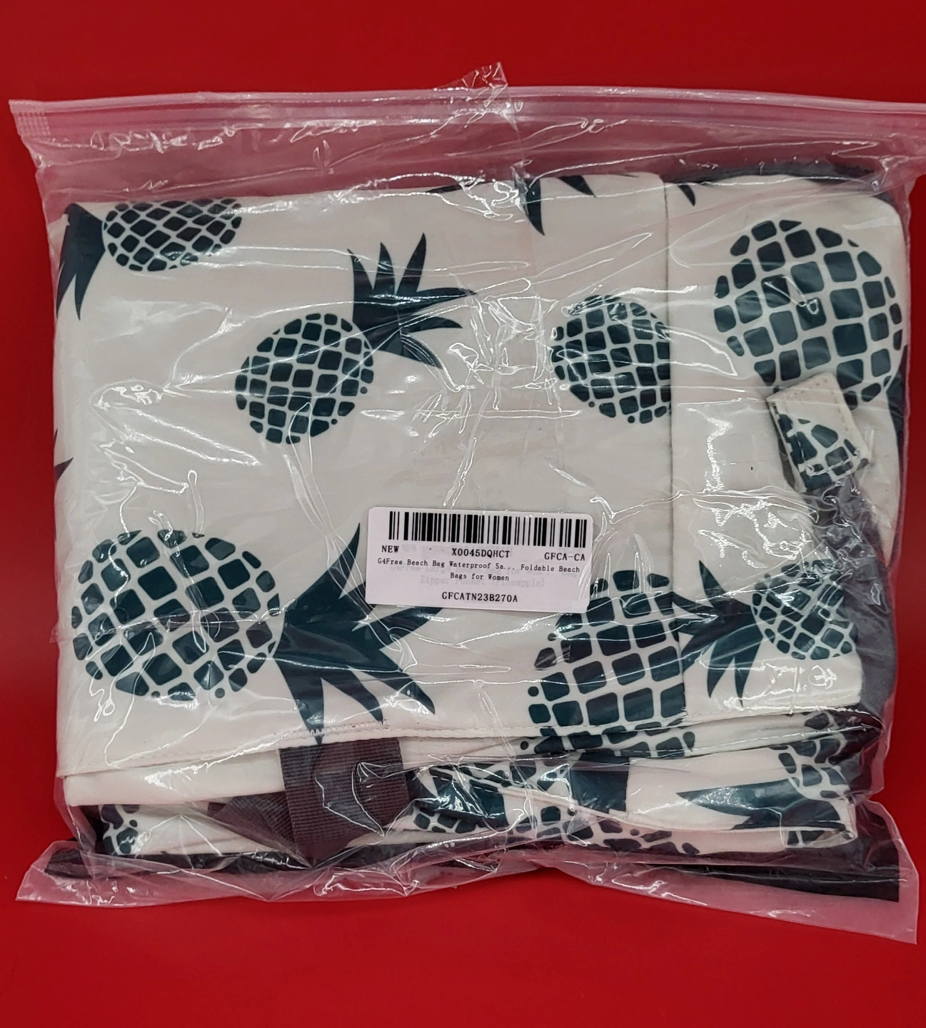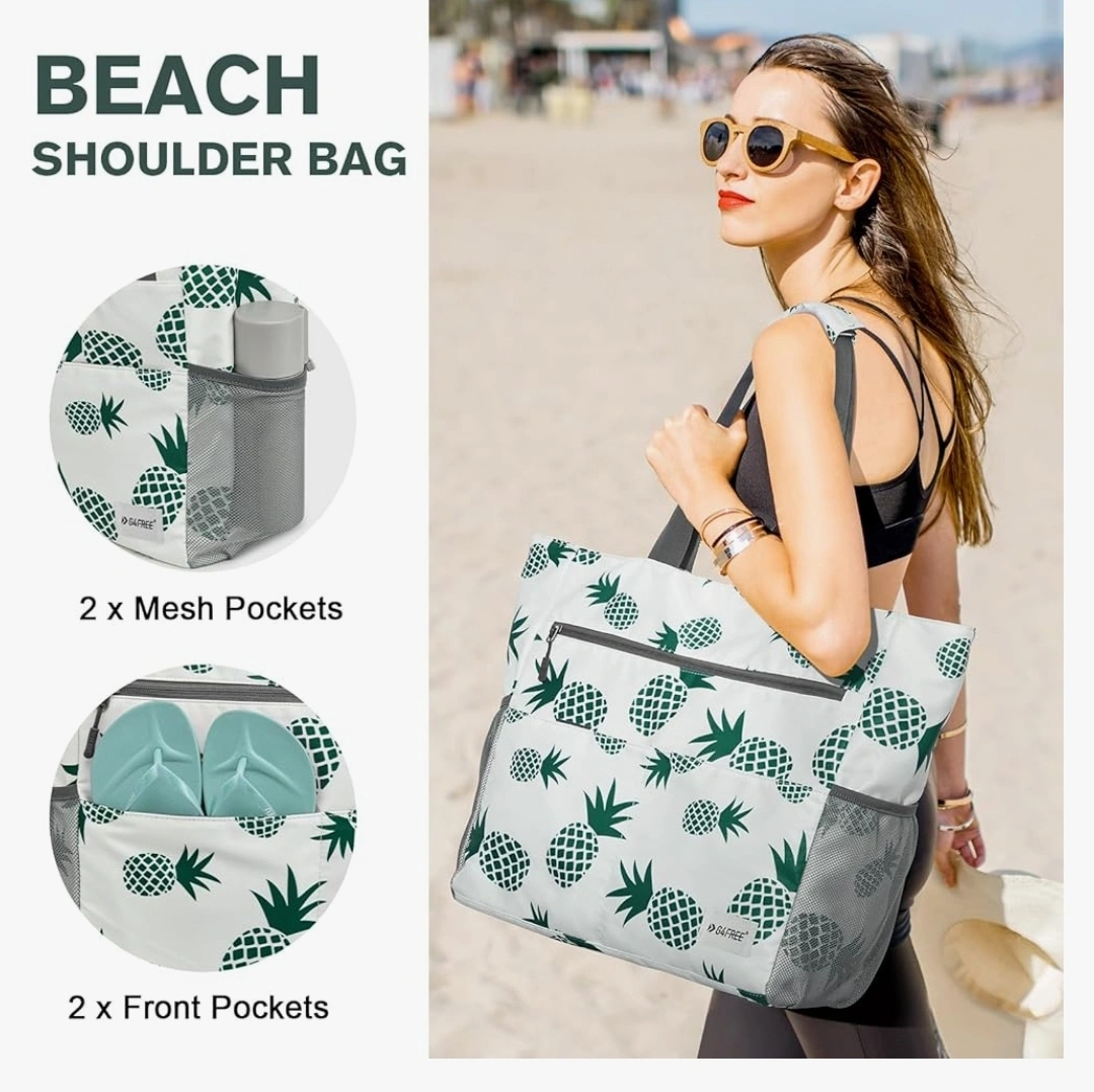 Beach shoulder bag. Featuring a pineapple pattern. Front and mesh pockets. A great place to keep your things safe and organized when heading to the beach.