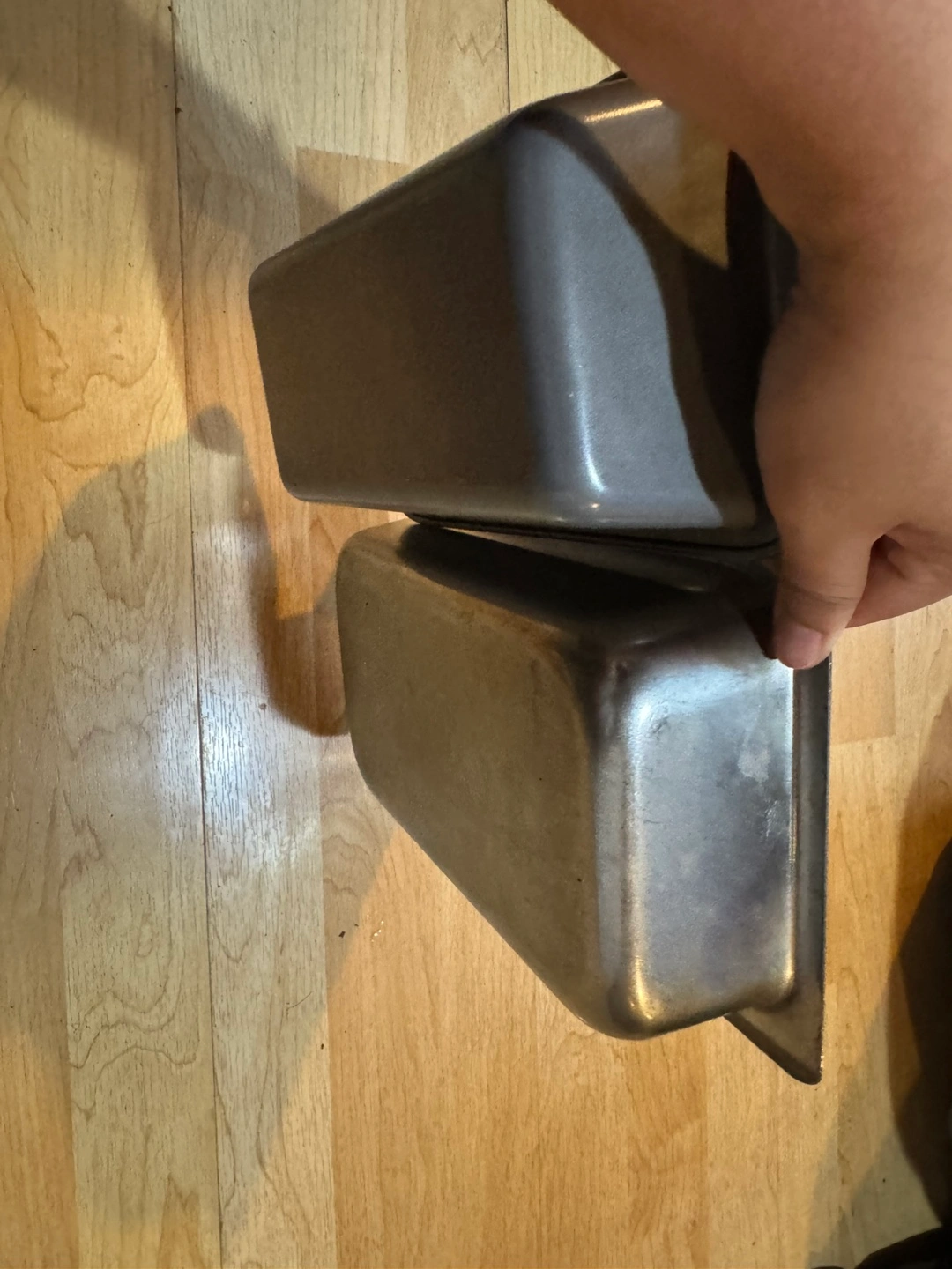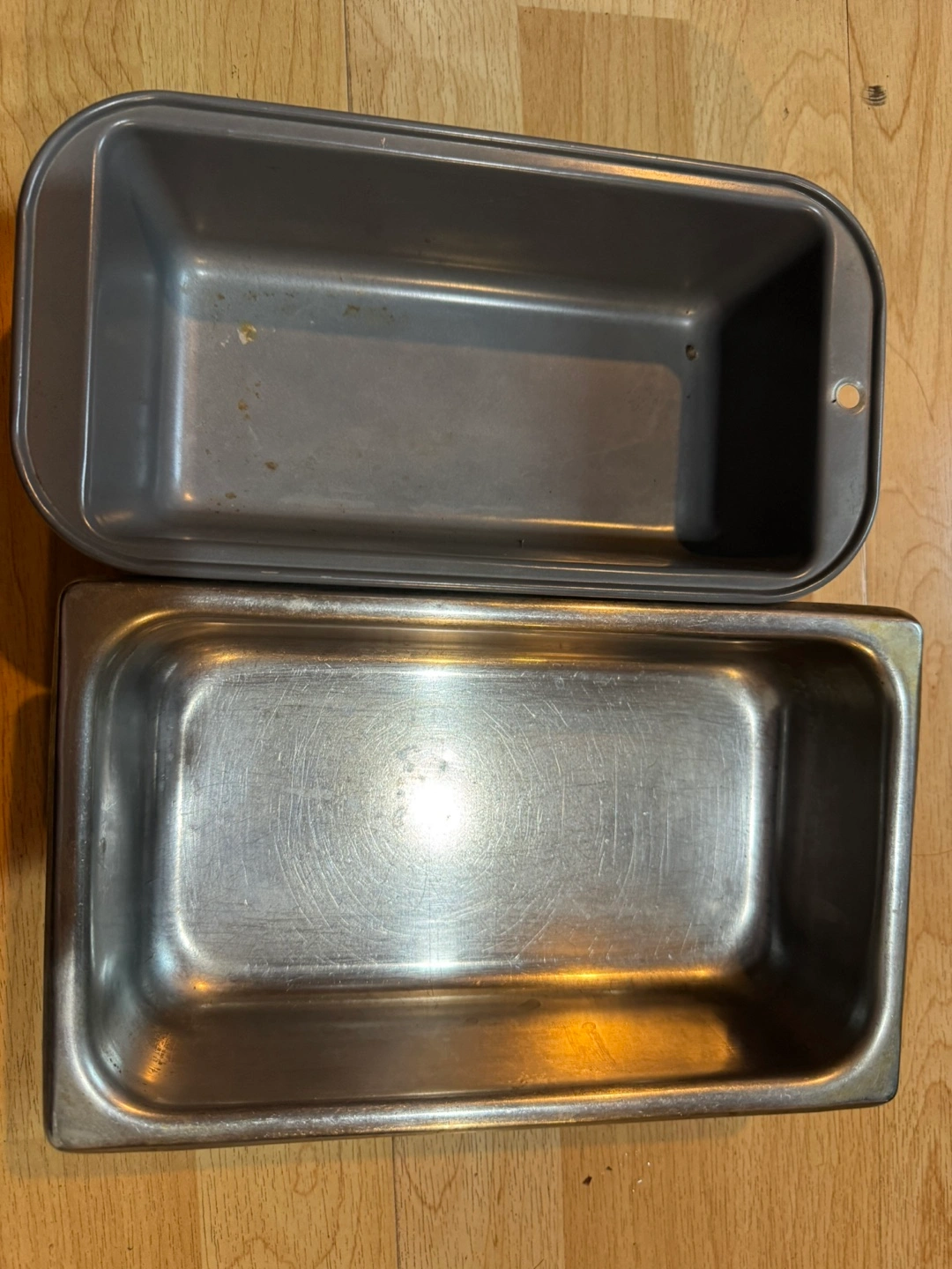 Two rectangular baking pans. One is metallic, the other is grey. The pans appear to be gently used and show some wear. Baking can be a great way to unwind after a long day.