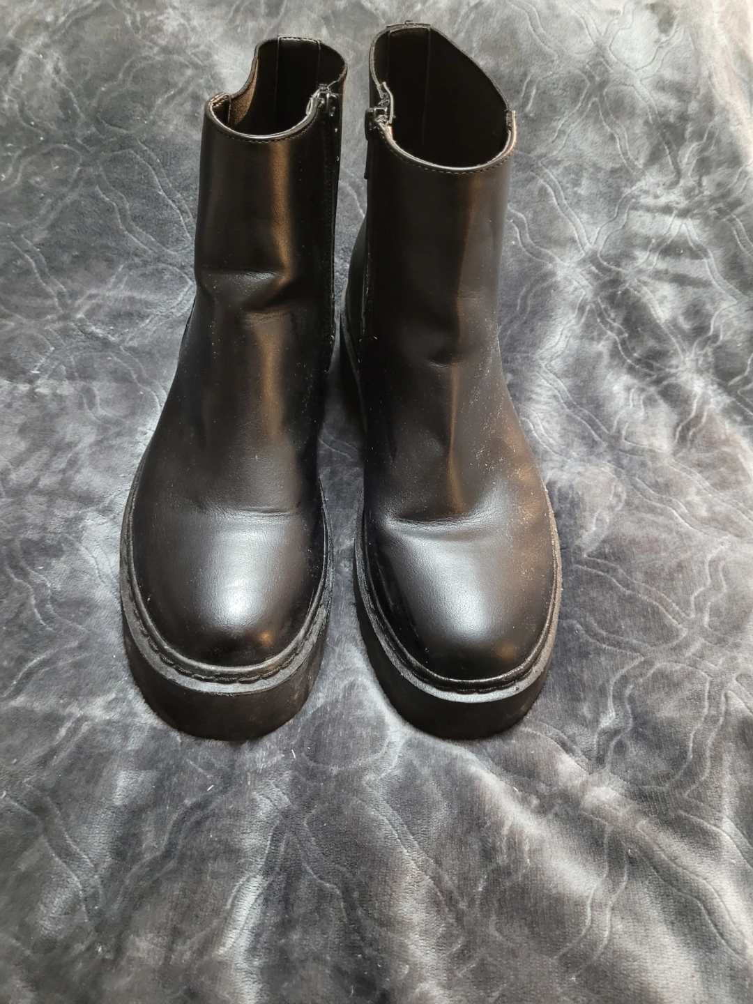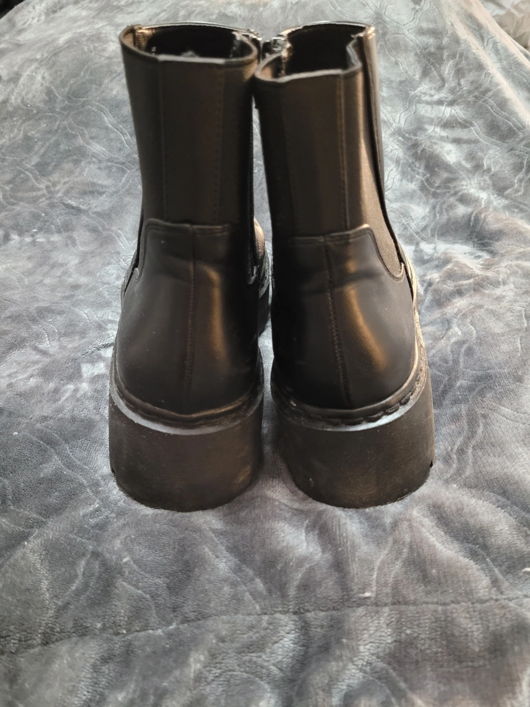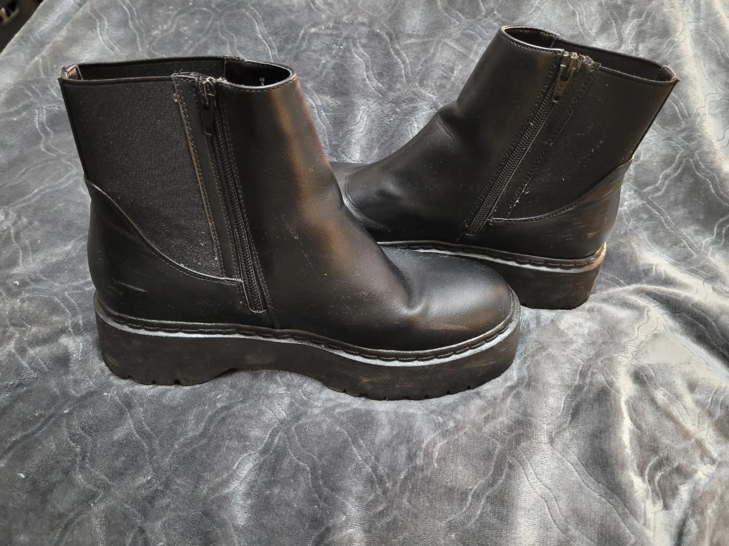 Black ankle boots with elastic side panels. Features a zip closure, round toe, and a platform sole. Comfortable, but selling because I should have purchased half a size smaller.